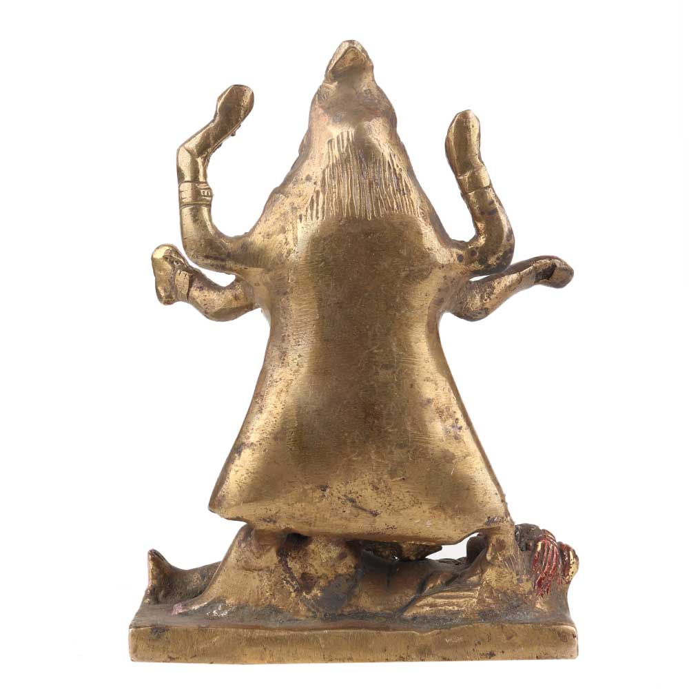 Embellish your home with this tribal style Hand Painted Brass Goddess Kali Statue Standing On Lord Shiva wearing a garland of skulls around her neck. It can be placed in temples, schools, offices, or the Place You Adore Most.