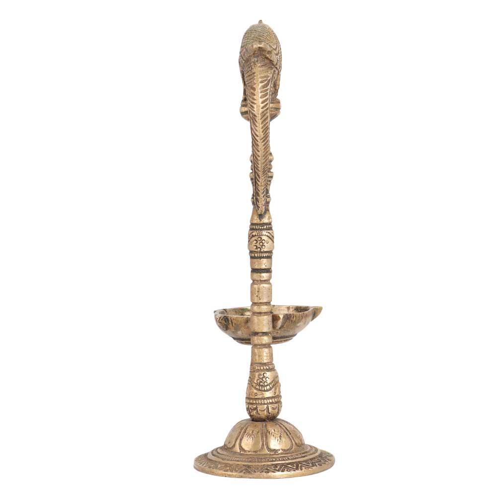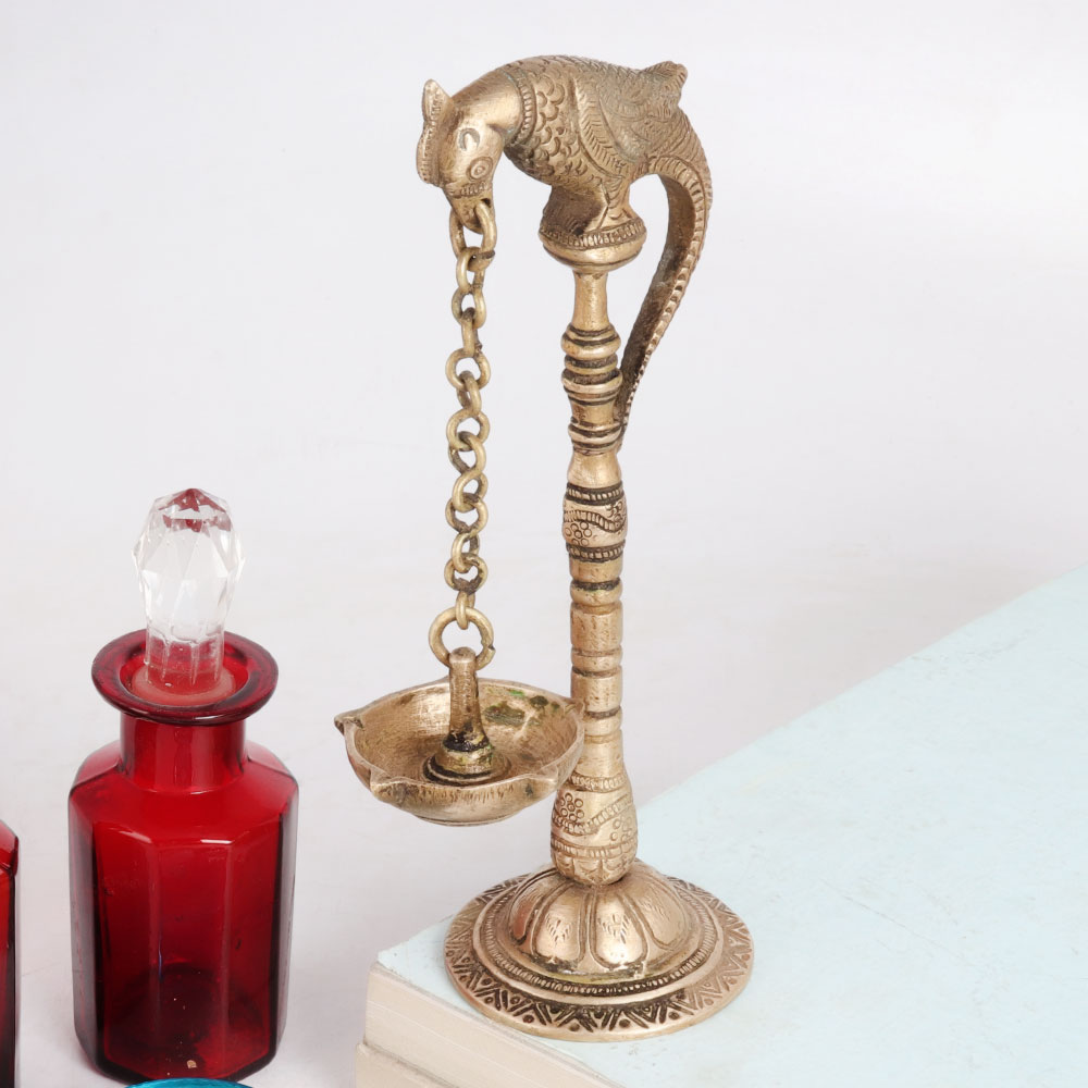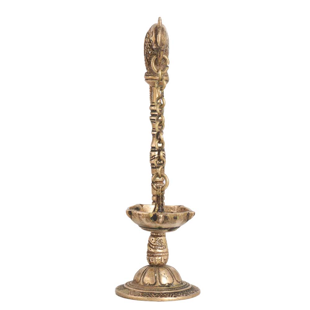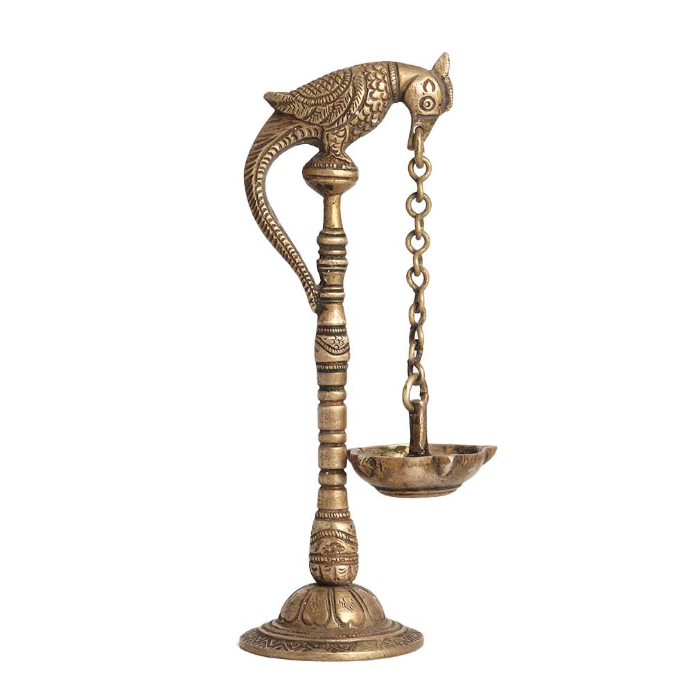 A beautiful oil lamp crafted using traditional methods from high quality brass. This handmade artefact is carved with a parrot on top, holding a chain lamp with its beak. An attractive lamp to use on special occasions with your family or friends. This brass lamp will remind you of your rich heritage when it is in your home. It is made by professional Indian artisans with their hands to ensure an eye-catching look. It is made with intricate details that delivers a long lasting impression to the interior decor. Gift this brass oil lamp to your loved ones on special, festive or auspicious occasions.