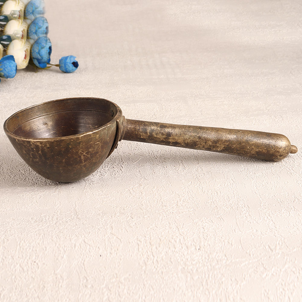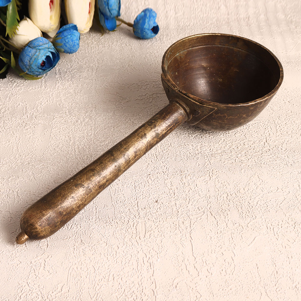 Enhance your decor with a touch of timeless elegance by adding this exquisite Vintage Brass Holy Spoon to your collection. Crafted with precision and care by highly talented Indian artisans, this piece showcases the rich heritage of traditional craftsmanship. The spoon features an antique brown finish and is a testament to the mastery of these artisans. Handmade from high-quality brass, this ornate spoon serves multiple purposes. Its versatility allows it to be a striking decorative piece in your home, office, hotel, cafe, shop, or restaurant. Its intricate design and historical appeal make it a captivating addition to any space. For those seeking spiritual significance, this holy spoon is ideal for havan ceremonies, adding a sacred touch to your rituals. Moreover, it's a splendid addition to any vintage collection, and its unique charm can be showcased at exhibitions, serving as a conversation piece. This Vintage Brass Holy Spoon also makes for a thoughtful and cherished gift, perfect for your family, friends or relatives on special, festive, or auspicious occasions. Whether you choose to use it in a religious context or as a decorative statement, this handmade masterpiece will leave a lasting impression.