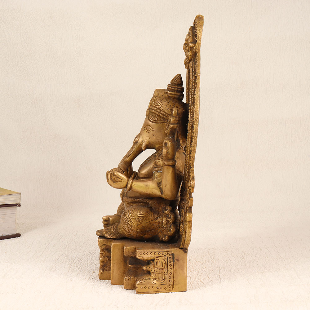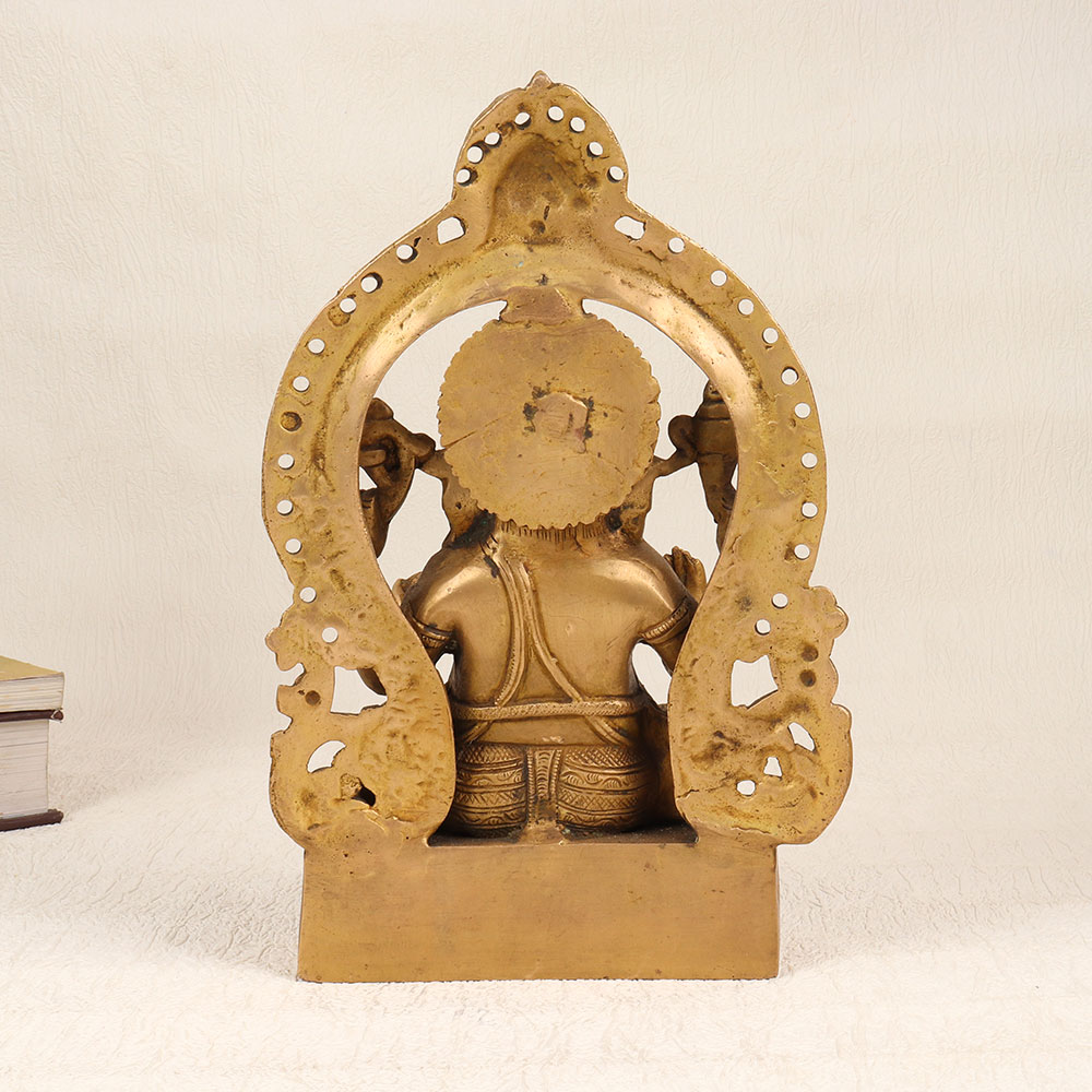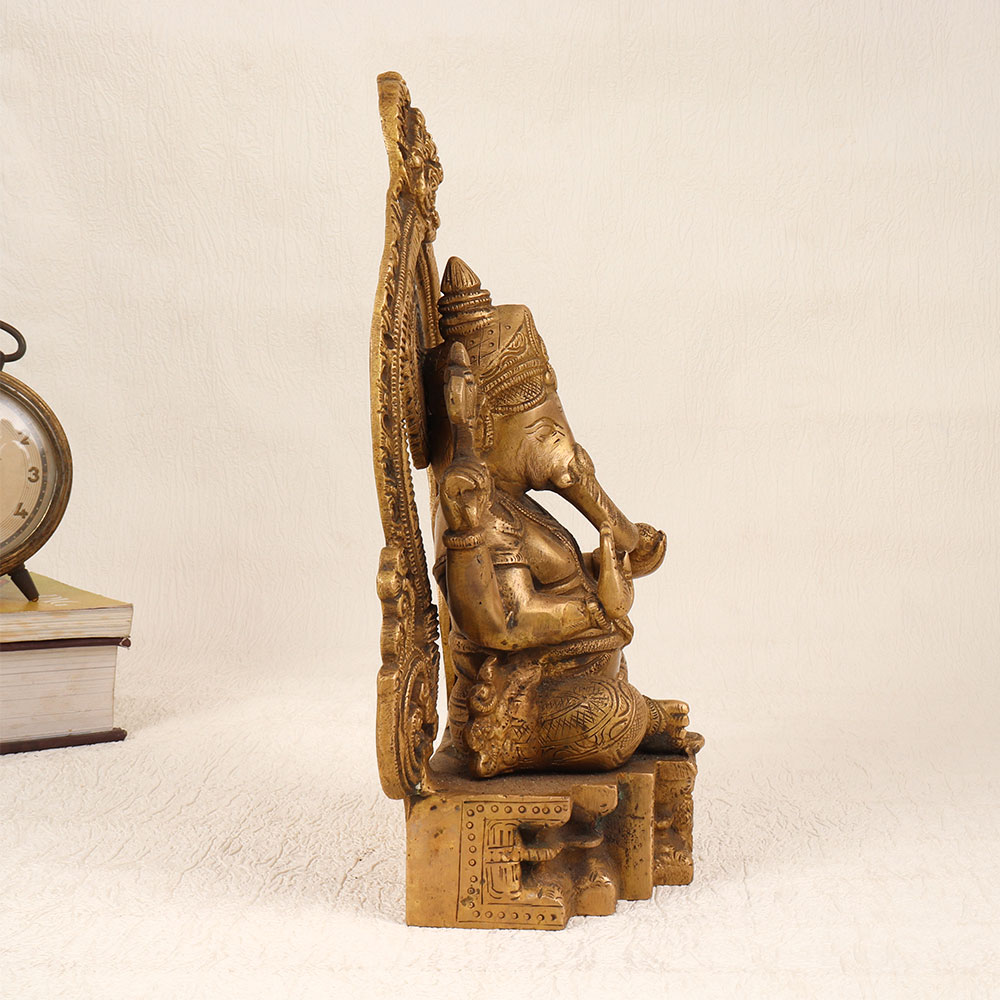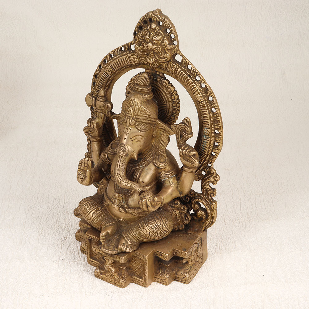 Enhance your spiritual and aesthetic space with this exquisite Brass Lord Ganesha Statue featuring a meticulously crafted Prabhavali and adorned with an enchanting antique brown finish. Handmade by highly skilled Indian artisans using premium-quality brass, this divine creation seamlessly blends tradition with artistry. The intricately designed Lord Ganesha sits majestically, exuding an aura of divinity and grace. The Prabhavali surrounding the deity enhances the overall appeal, creating a harmonious and captivating visual experience. The antique brown finish adds a touch of timeless elegance, making it a standout piece suitable for various settings. Versatile in its placement, this statue is ideal for your home, office, restaurant, hotel, or cafe prayer room. Beyond its spiritual significance, it serves as a remarkable decorative element that effortlessly complements any interior. As a unique addition to a vintage collection, this brass Ganesha statue becomes a conversation starter, reflecting both cultural richness and artistic finesse. Moreover, this handmade masterpiece makes for a thoughtful and meaningful gift for your family, friends or relatives on special, festive, or auspicious occasions. Imbued with cultural significance and artistic brilliance, this Brass Lord Ganesha Statue is a timeless expression of faith and a testament to the craftsmanship of skilled Indian artisans.