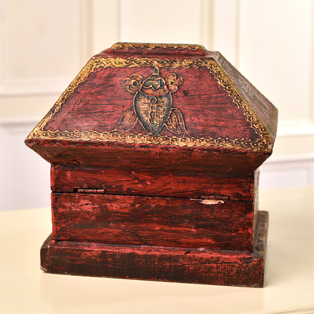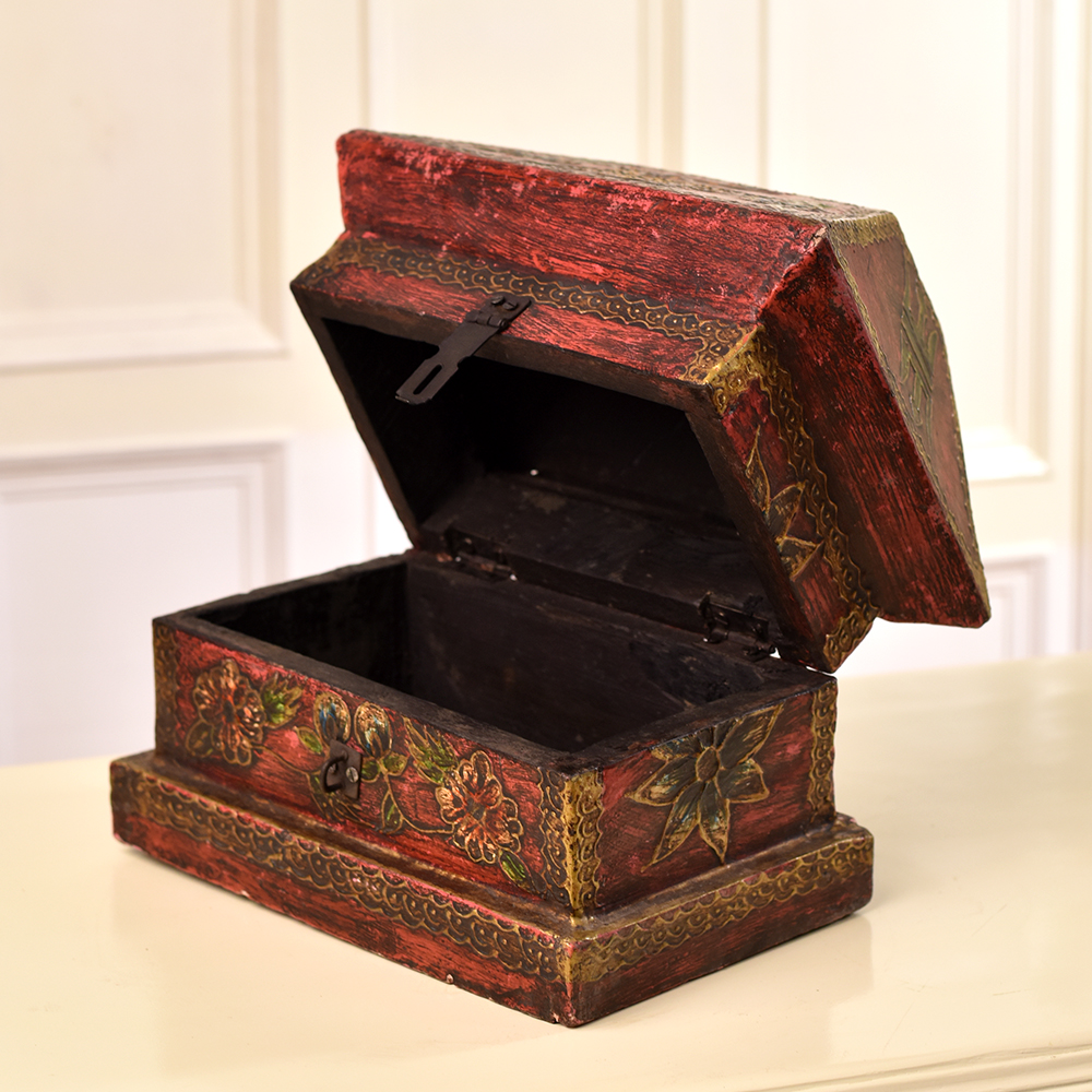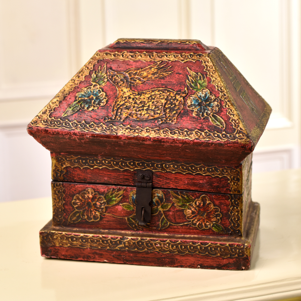 Buy a handmade wooden box online which is a testament to the skillful artistry of Indian craftsmen. Crafted from high-quality wood, the box boasts a rich tapestry of animal and floral engravings, each stroke telling a story of tradition and precision. The vibrant, multi-coloured palette adds a touch of whimsy, making it a visual delight. Equipped with a charming latch, this box is not only a repository for your cherished jewelry but also a home for small trinkets and treasures. Its versatility extends beyond practicality - it's a piece of art that begs to be showcased. Picture it adorning your dressing table or stealing the spotlight at an exhibition, capturing attention with its intricate details. As a gift, this box transcends the ordinary. Delight your family, friends or relatives on special or festive occasions with a token of artistry and tradition, a box that holds not just jewelry but also the essence of skilled craftsmanship and heartfelt sentiments.