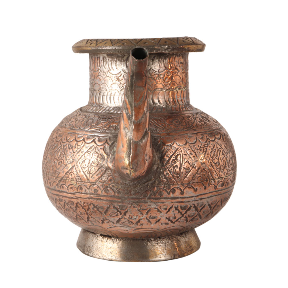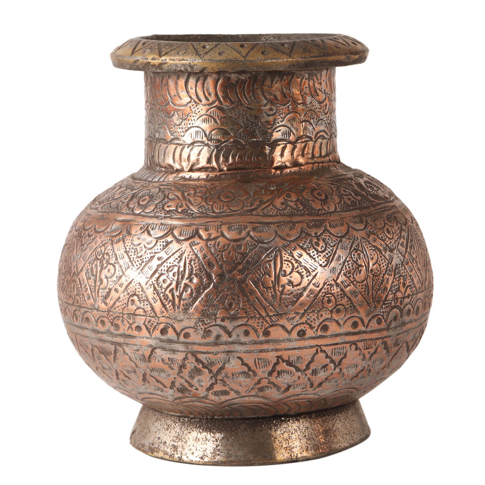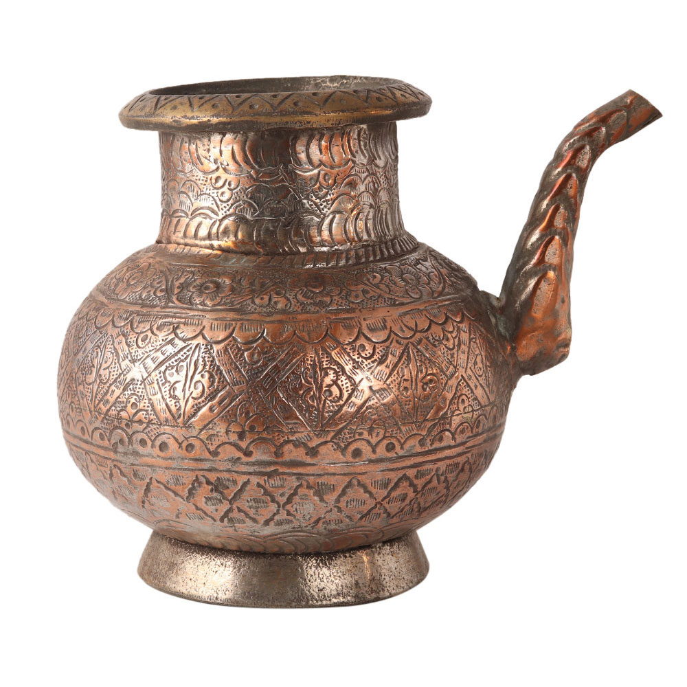 This handmade copper holy water pot is engraved with beautiful floral designs. It has Islamic carvings. Holy water pots are used in temples and homes.