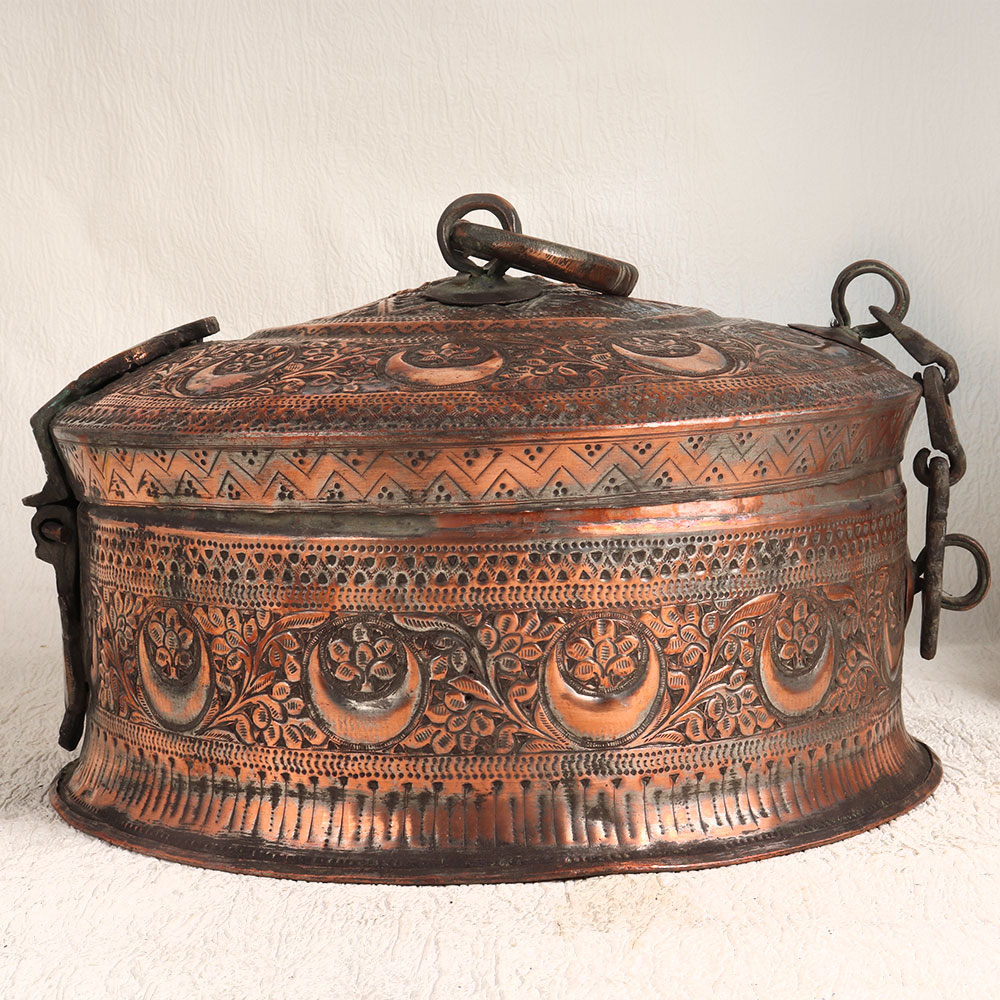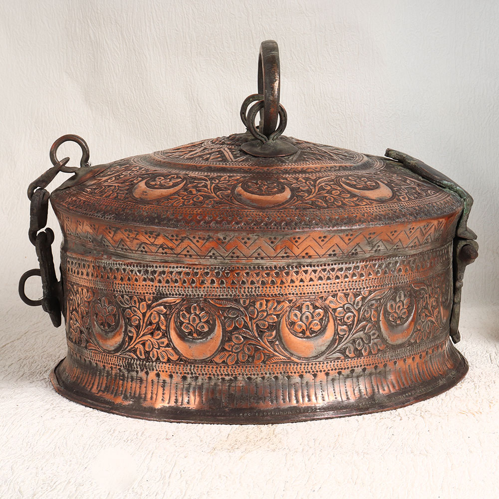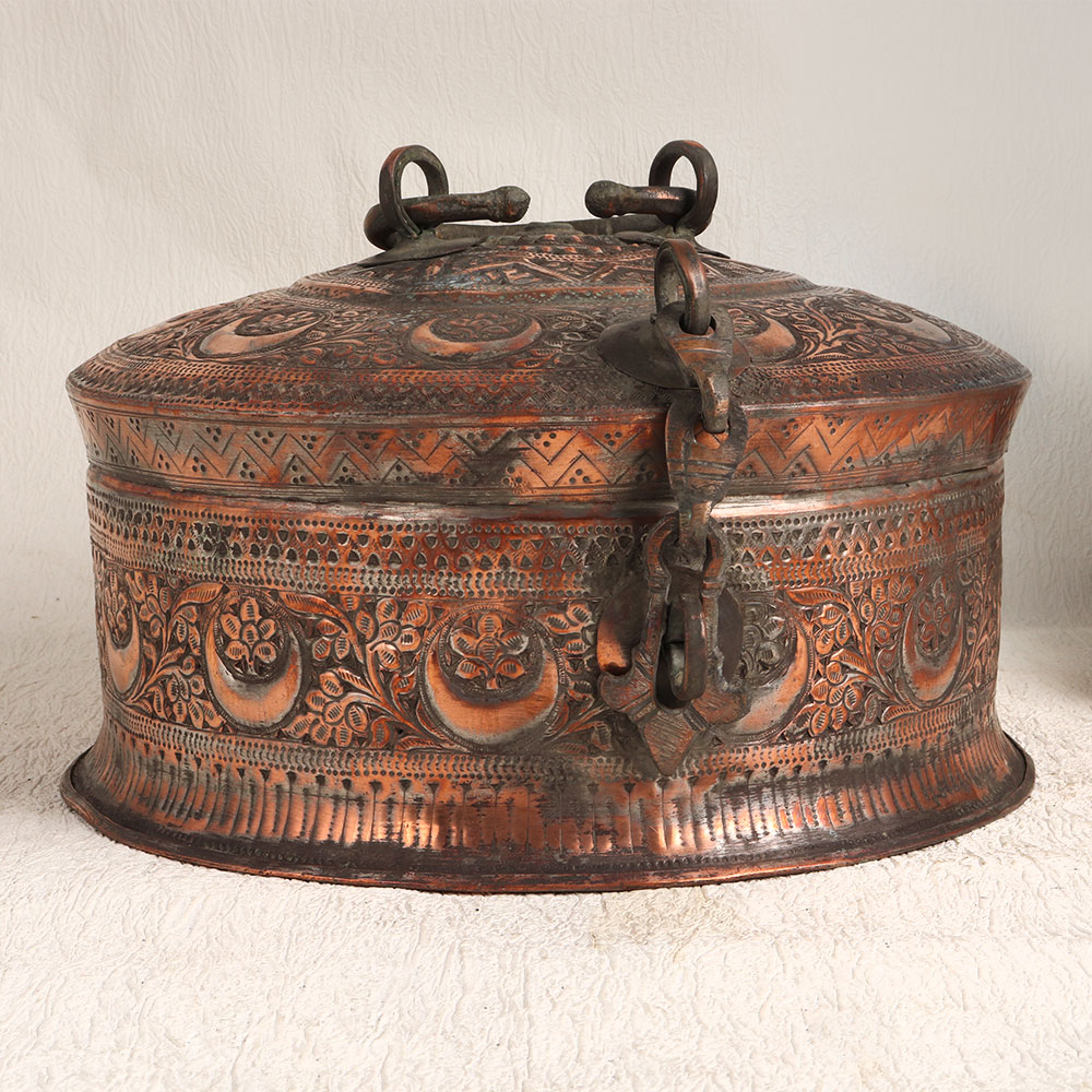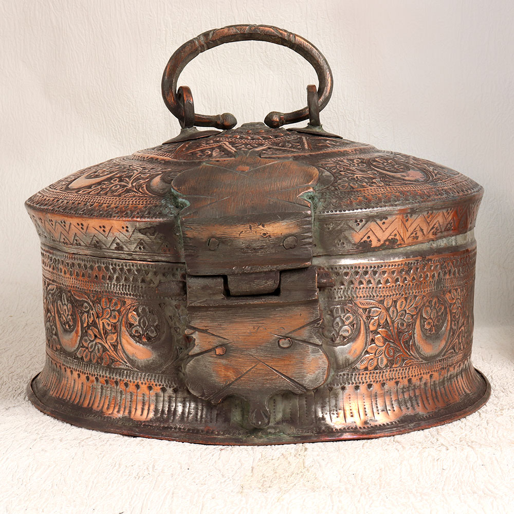 Enhance your interior with the timeless charm of our Vintage Jewelry Box that is a true masterpiece of craftsmanship. Handmade by highly skilled Indian artisans, this exquisite box embodies the intricate beauty of Islamic Art. Its stunning carving work, inspired by centuries-old traditions, adorns the exterior, creating an ornate and captivating piece. The antique brown finish adds an aura of old-world elegance, perfectly accentuating the box's high-quality copper material. This jewelry box is a symbol of refined taste and craftsmanship, embodying both form and function. Versatile in its use, this box can grace your home, office, restaurant, hotel, cafe, or shop, enhancing any space with its antique allure. Not just a decor piece, it also serves as a secure storage unit for your valuable items, precious stones, and jewelry. Whether you're a collector of vintage treasures or wish to start a collection, this box is a must-have addition. Furthermore, it makes for a thoughtful and exquisite gift for your family, friends or relatives on special, festive, or auspicious occasions. Embrace the legacy of Indian artistry with this exceptional Vintage Jewelry Box and add a touch of timeless sophistication to your surroundings.