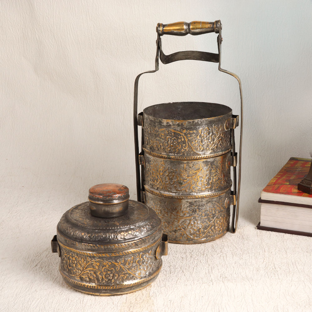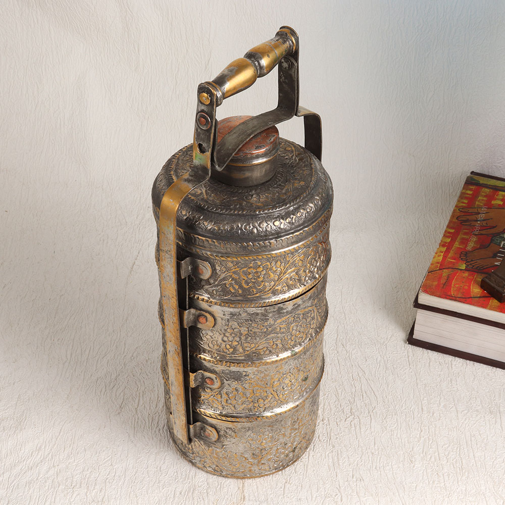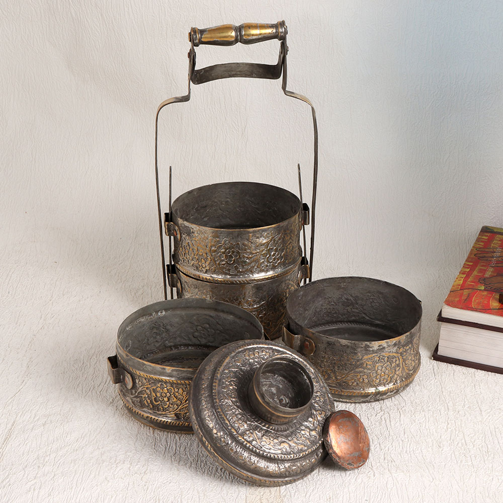 A Vintage Tiffin Box that is a true masterpiece crafted by highly skilled and experienced Indian artisans. This stunning piece exudes timeless elegance with its intricate Islamic Art-inspired carving in an antique brown finish, which beautifully complements its high-quality copper construction. With four compartments, this Tiffin box offers a glimpse into the traditional culinary culture of India. However, as a vintage collectible, we recommend using it for decorative purposes only. Its remarkable design makes it a statement piece that can adorn your home, office, restaurant, hotel, cafe, or shop. Adding this vintage gem to your collection will transport you to an era where artistry and craftsmanship reigned supreme. Its rich, aged patina and detailed engravings tell a story of cultural heritage and impeccable workmanship. What better way to celebrate special, festive, or auspicious occasions than by gifting your family, friends or relatives this unique Tiffin box? Share the legacy of India's artisanal heritage and bring a touch of history into their lives with this stunning piece of functional art.