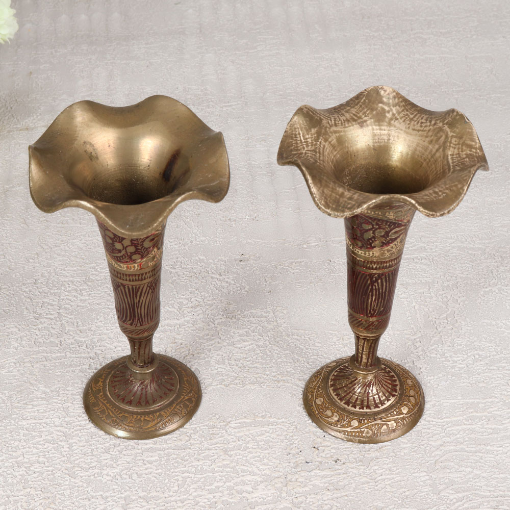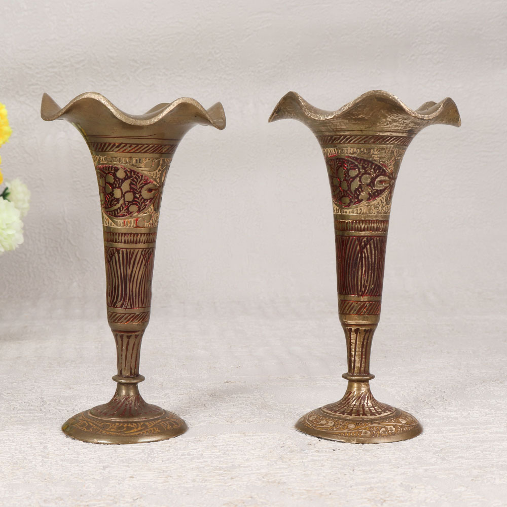 Enhance your interior with this exquisite set of 2 vintage brass flower pots, each a testament to the timeless artistry of Islamic craftsmanship. Handcrafted by skilled artisans, these pots showcase intricate engravings that reflect the rich heritage of Islamic art. The antique brown finish adds a touch of nostalgia, creating a warm and inviting ambiance. Made from high-quality brass, these flower pots are not just decorative but also durable. Their versatile design makes them suitable for various settings – adorn your home, office, restaurant, hotel, or cafe with a touch of vintage charm. These pots serve as an ideal indoor flower arrangement, blending seamlessly with any decor style. A perfect addition to your vintage collection, these flower pots make for thoughtful gifts on special, festive, or auspicious occasions. Whether displayed individually or as a pair, the vintage allure of these handmade treasures is sure to captivate and inspire admiration. Embrace the elegance of the past with these timeless brass flower pots.
