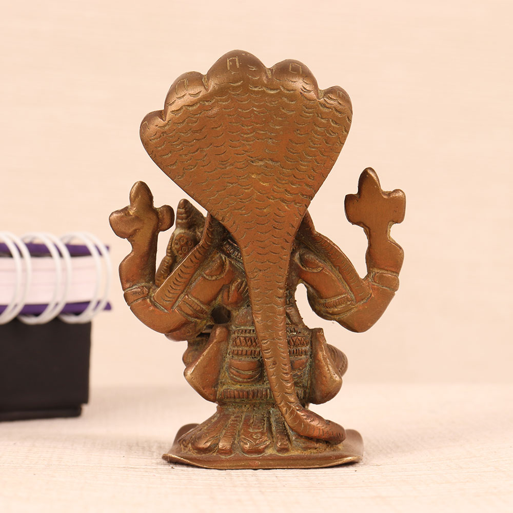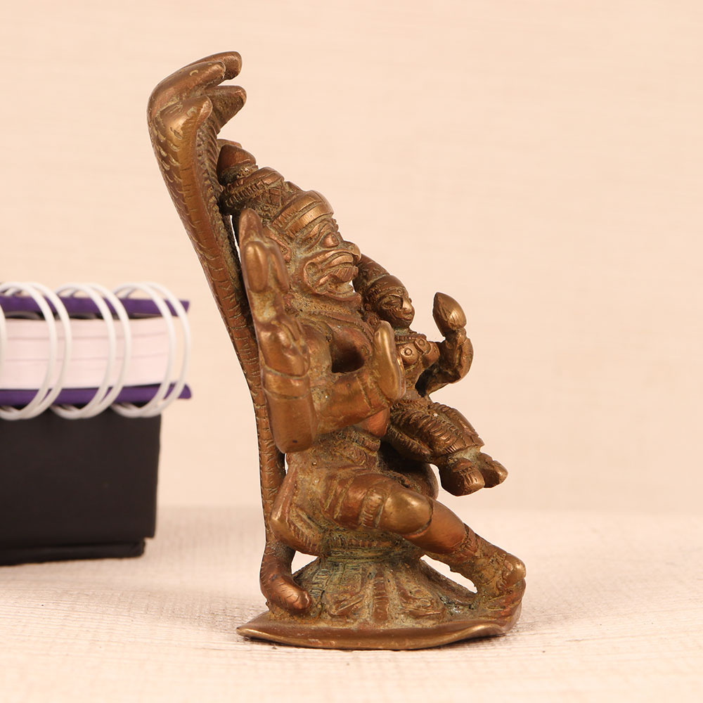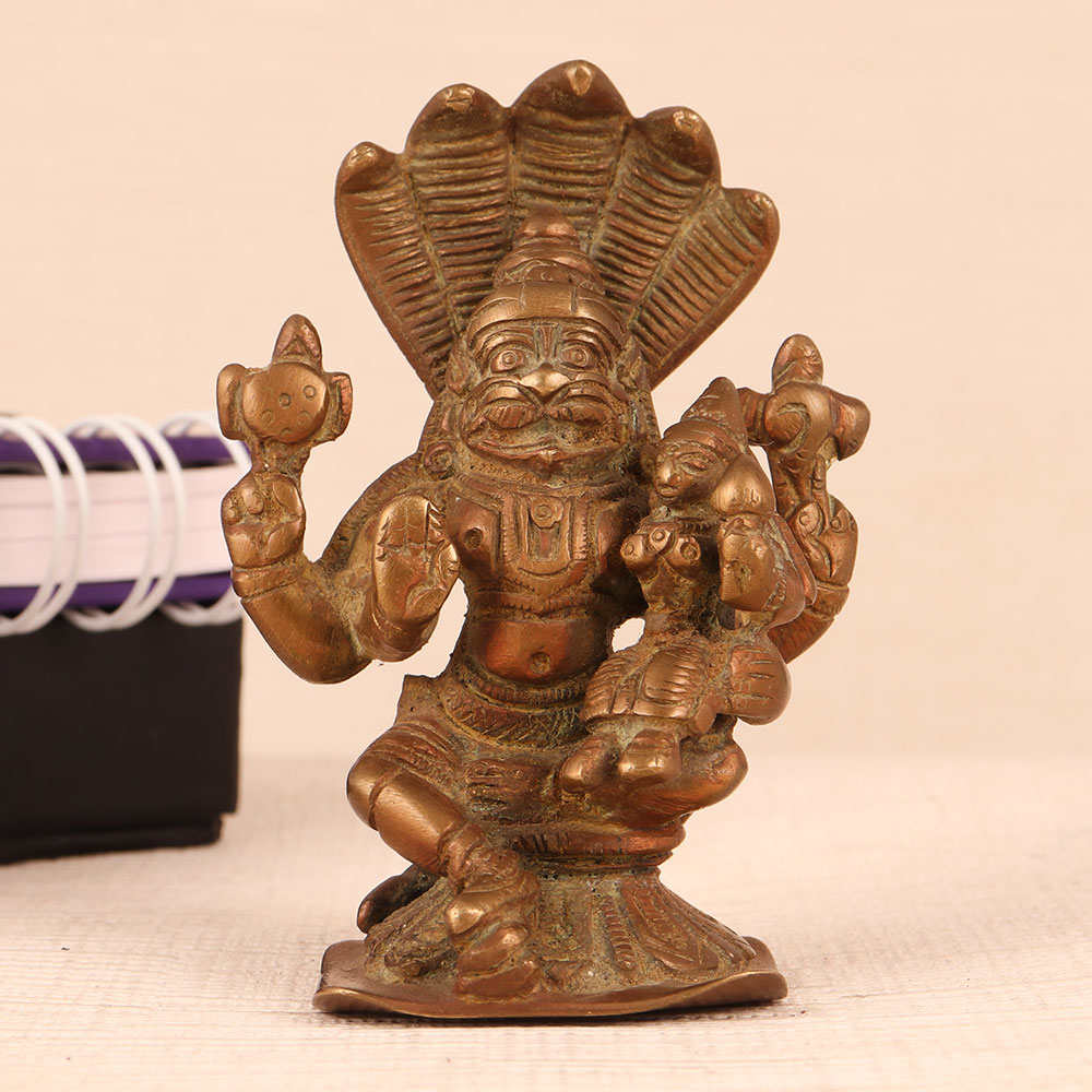 This Brass Statue of Lord Narasimha with Goddess Lakshmi is a magnificent piece of artistry that seamlessly blends spirituality, tradition, and craftsmanship. This exquisite masterpiece is handcrafted by skilled Indian artisans that embodies the essence of devotion and elegance. Crafted from high-quality brass, this statue showcases Lord Narasimha, the powerful incarnation of Lord Vishnu, sitting regally on a meticulously designed platform. What makes this piece truly unique is the presence of Goddess Lakshmi seated gracefully on his left lap, symbolizing prosperity and divine blessings. The antique brown finish adds a touch of timeless charm, making it a versatile addition to any space. Whether you're looking to enhance your home, office, restaurant, hotel, cafe, or shop's prayer room with an aura of spirituality and beauty, this statue is the perfect choice. Its intricate detailing and spiritual significance make it an ideal object of worship and decoration. For collectors of vintage treasures, it's a must-have addition to your collection. Furthermore, this statue serves as an exceptional gift for your family, friends or relatives on special, festive, or auspicious occasions. By gifting this Lord Narasimha and Goddess Lakshmi brass statue, you're not just sharing a piece of art; you're sharing blessings, prosperity, and a piece of Indian heritage. Elevate your surroundings and celebrate the divine with this remarkable creation, meticulously crafted by skilled artisans.