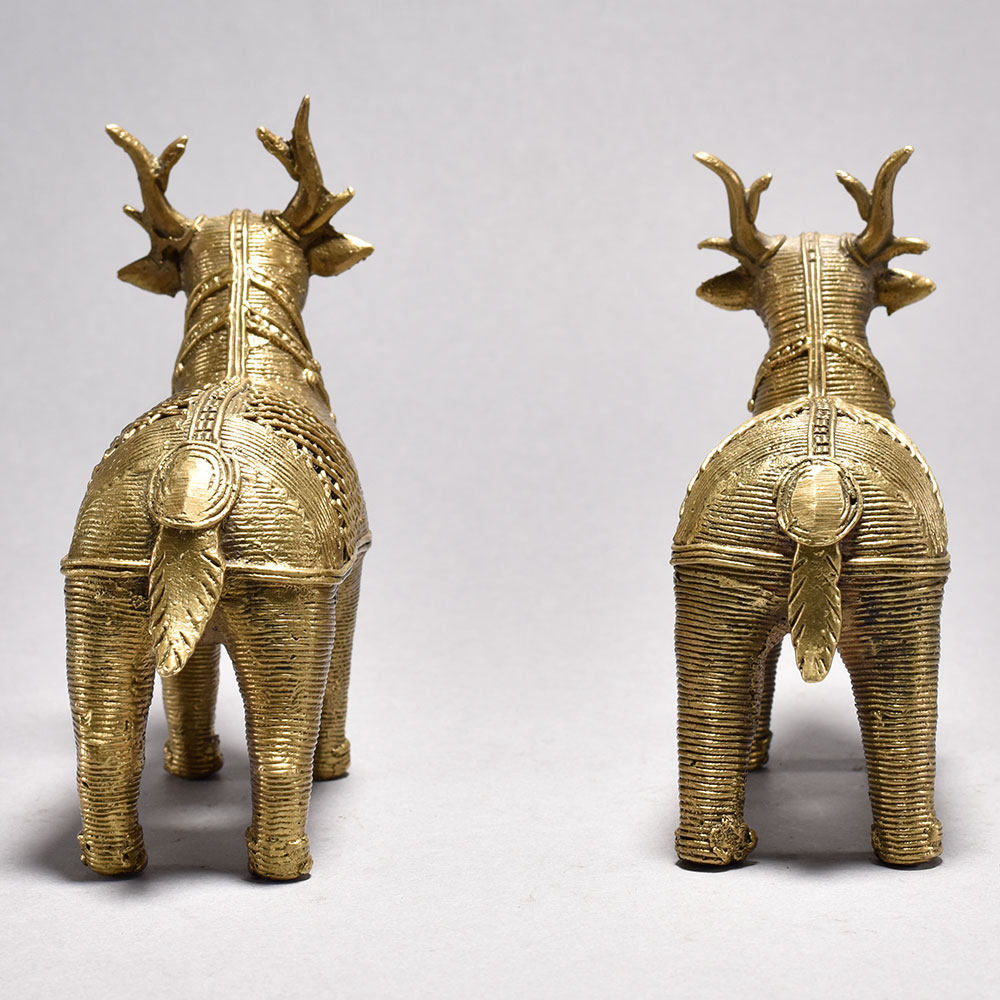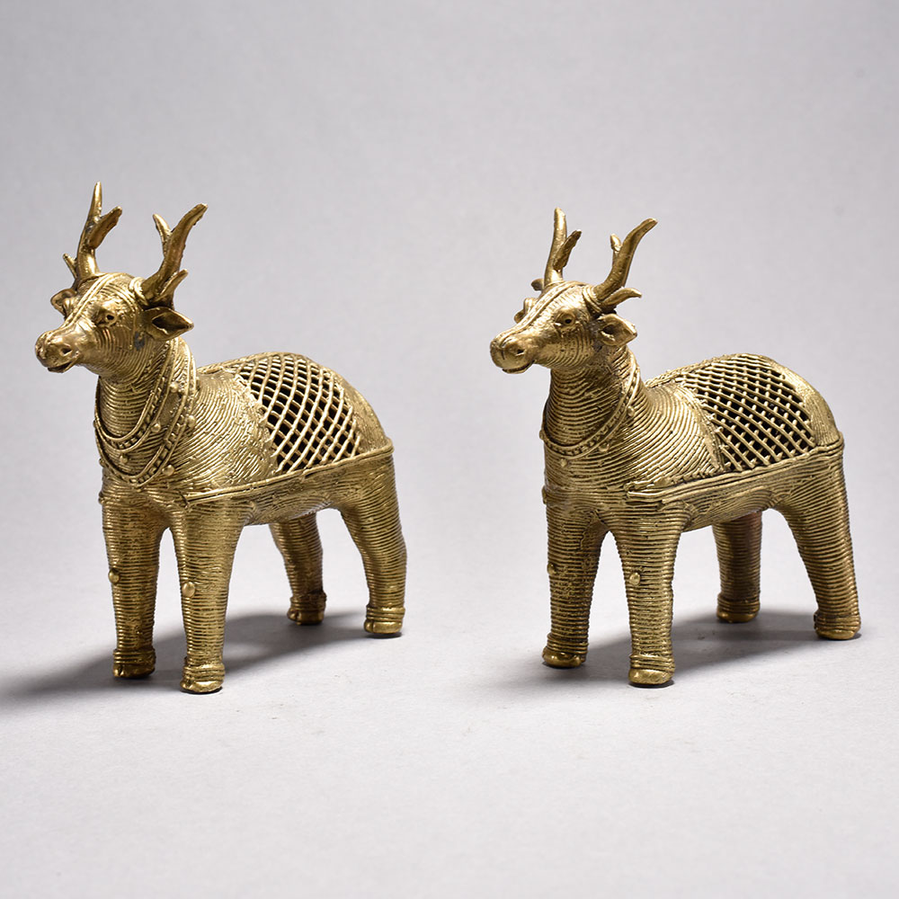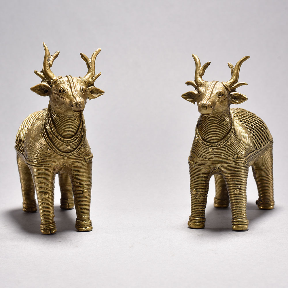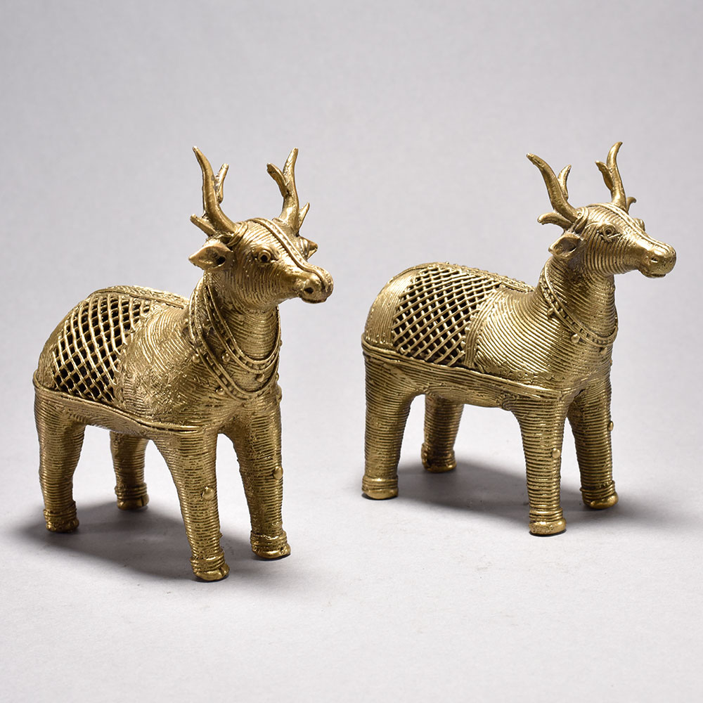 Bring home the timeless charm of traditional Indian craftsmanship with this beautifully handcrafted Metal Dhokra Deer Statue Pair. Made using the ancient lost-wax casting technique, each deer showcases intricate detailing and a stunning jali (lattice) pattern that highlights the artisans skill and cultural heritage. The warm brass-toned finish adds a rustic yet elegant appeal, making these statues perfect for both modern and traditional interiors. Ideal for living rooms, sideboards, office desks, entryways, or festive dcor, this Dhokra deer pair instantly uplifts the ambiance with its artistic presence. The statues represent harmony, grace, and prosperitymaking them an excellent gift choice for housewarmings, anniversaries, festive celebrations, or for collectors of tribal and ethnic art. Thoughtfully crafted by skilled tribal artisans of India, each piece is completely handmade, ensuring slight variations that enhance its uniqueness and authenticity. These statues are not just dcor items but meaningful pieces of art that bring cultural richness into your home. Durable, elegant, and visually striking, this Metal Dhokra Deer Pair is a true embodiment of traditional artistry blended with timeless design.Key FeaturesHandcrafted using the traditional Dhokra lost-wax techniqueIntricate jali pattern with rich antique brass finishIdeal for home, office, festive, and gifting dcorEthnic tribal art collectible crafted by skilled artisans
