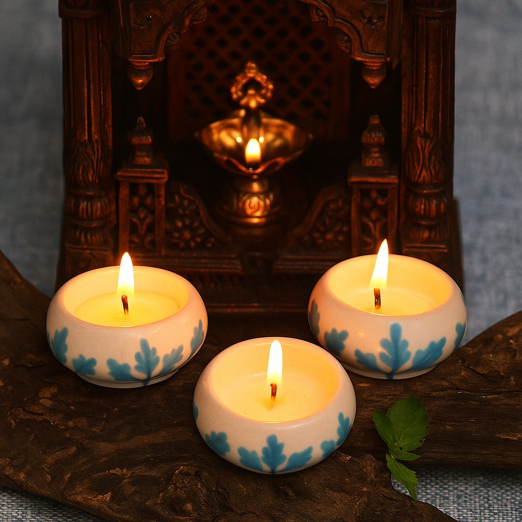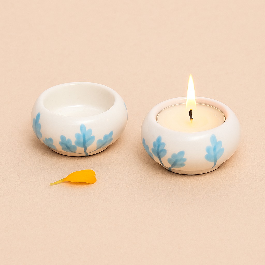 Enhance the ambiance of any space with our exquisite Ceramic Tea Light Holder. Meticulously crafted by highly skilled and experienced Indian artisans, this high-quality ceramic piece boasts a pristine white background adorned with a graceful sky blue leaf pattern, showcasing the seamless fusion of artistry and elegance. Tea light holders have long been cherished for their ability to infuse warmth and radiance into any setting. This piece is no exception, radiating a soothing glow that creates a serene atmosphere. Perfect for homes, restaurants, cafes, shops, or hotels, it adds a touch of sophistication to diverse environments. Whether you're celebrating a special occasion or seeking to create unforgettable moments with loved ones, our Ceramic Tea Light Holder is the classic decorative accessory. Its enchanting illumination provides a captivating backdrop, making cherished memories even more magical. Moreover, this exquisite creation isn't just for personal indulgence, it makes for an exceptional gift on special, festive, or auspicious occasions. Share the joy by presenting your loved ones with a token of artistry and warmth that will forever hold a place in their hearts.