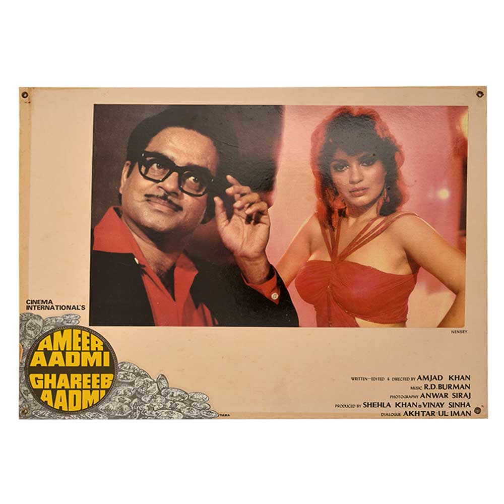 The poster is from the movie Ameer Aadmi Ghareeb Aadmi directed by Amjad Khan. The poster shows the leading actor Shatrughan Sinha with black spectacles along with the glamorous star of her times, Zeenat Aman.