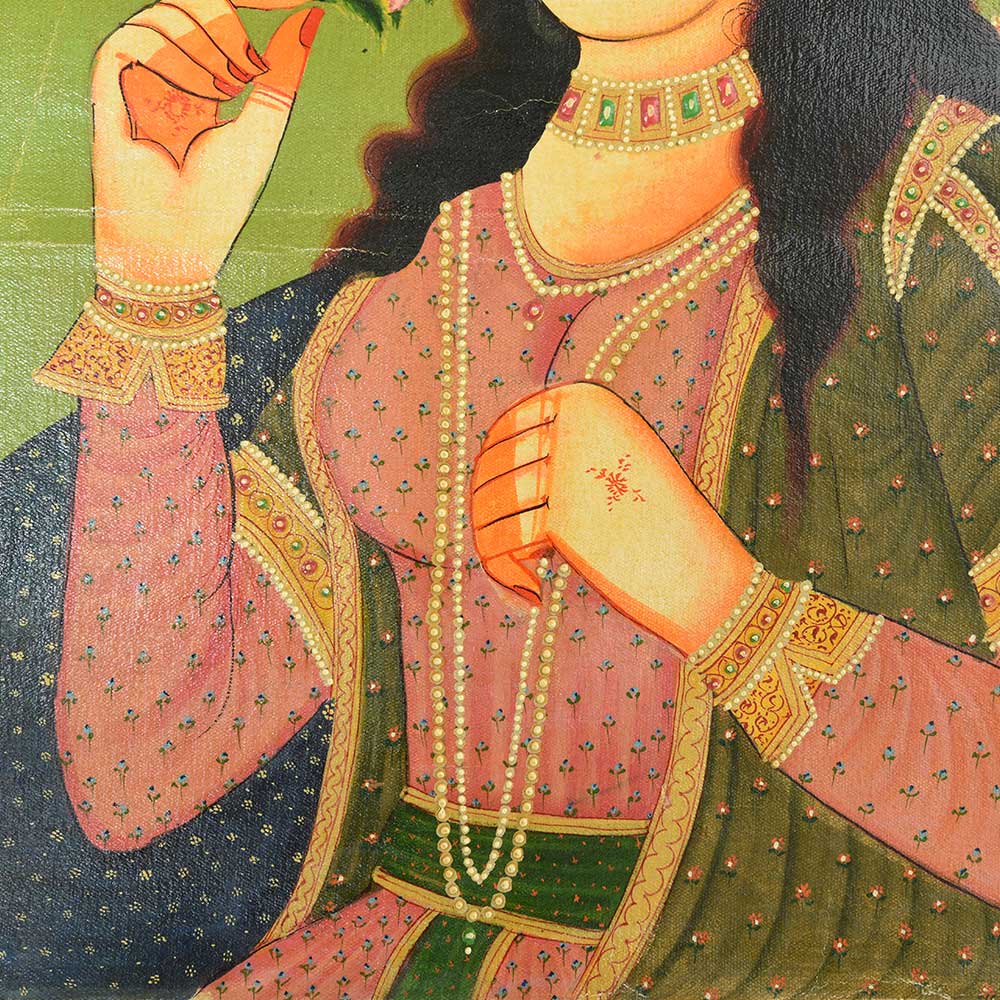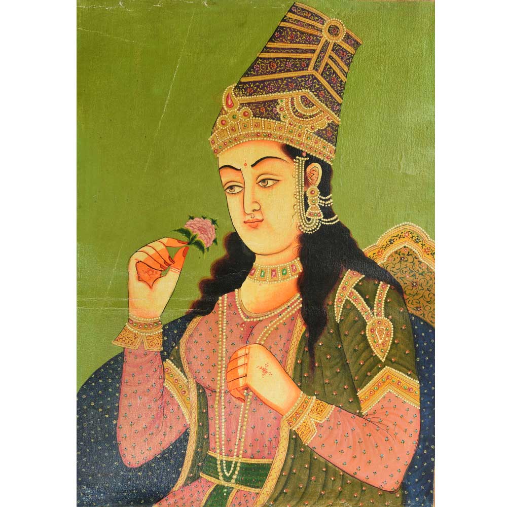This handmade Mughal painting of the Mughal empress Mumtaz mahal in lovely vibrant colours of the outfit as well as the background. It will make a fine addition to your collection.
