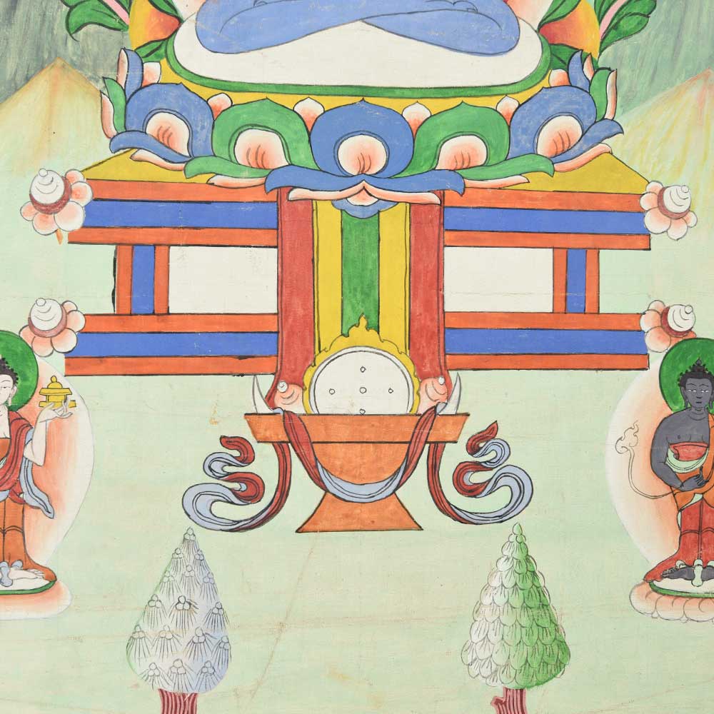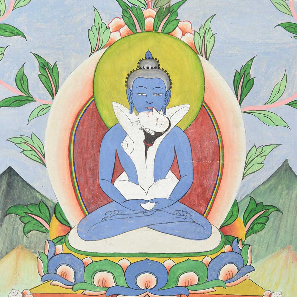 Tibetan buddhist tantra's most famous image. The thangkha painting is designed for those in the early stages of meditation made by the tibetan refugees in India painted on canvas using water-based paints and gold powders.
