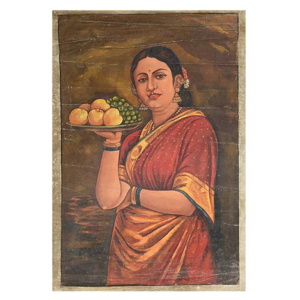 A handmade Indian canvas painting of a woman holding a plate of fruit for upholstery, office decoration as a gift to friends and family for housewarming, weddings and other occasions.