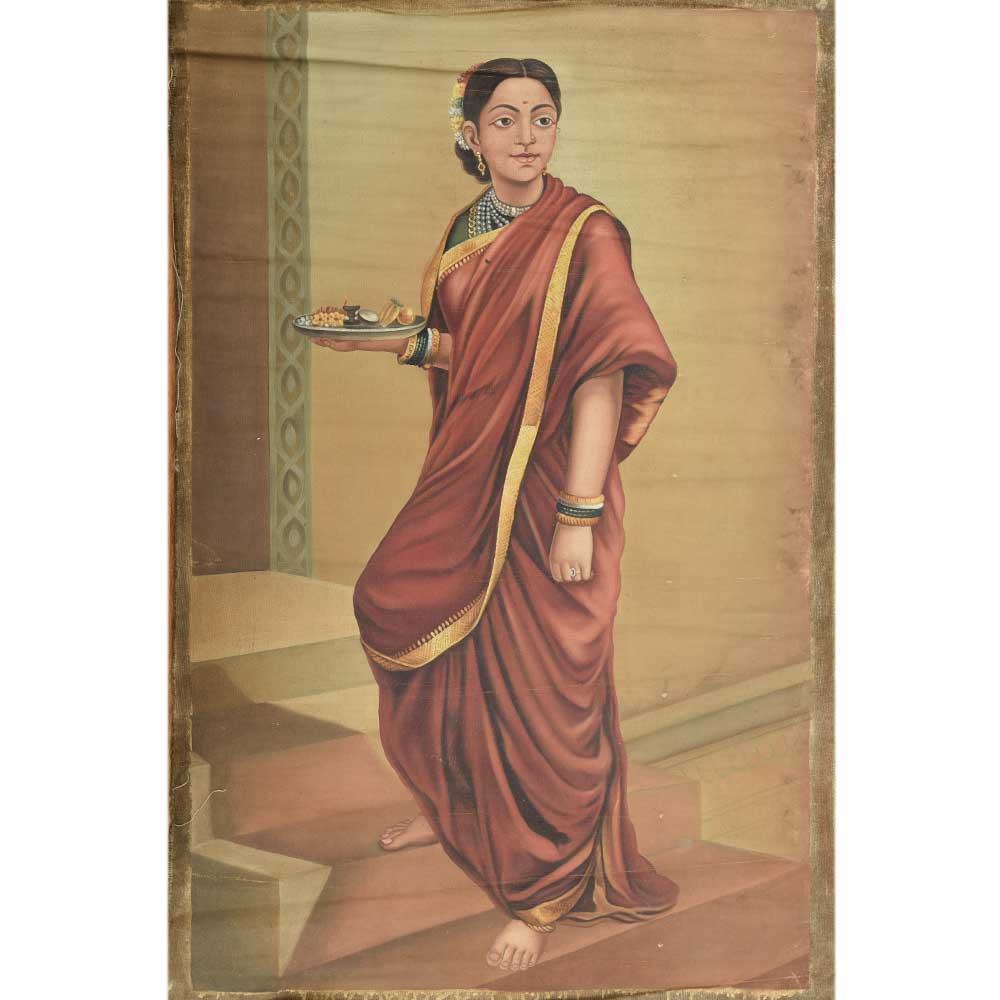 This colorful painting of a indian women going for puja in shiva temple. The lady has worn a nauvari sri with a floral garden tied to the bun. This painting makes the wallsour home , office or hotel look awesome, elegant and beautiful.