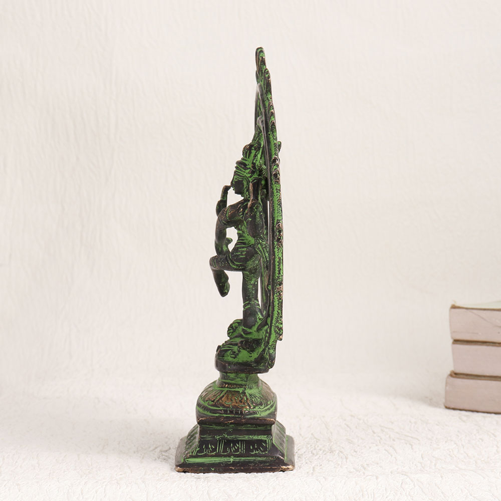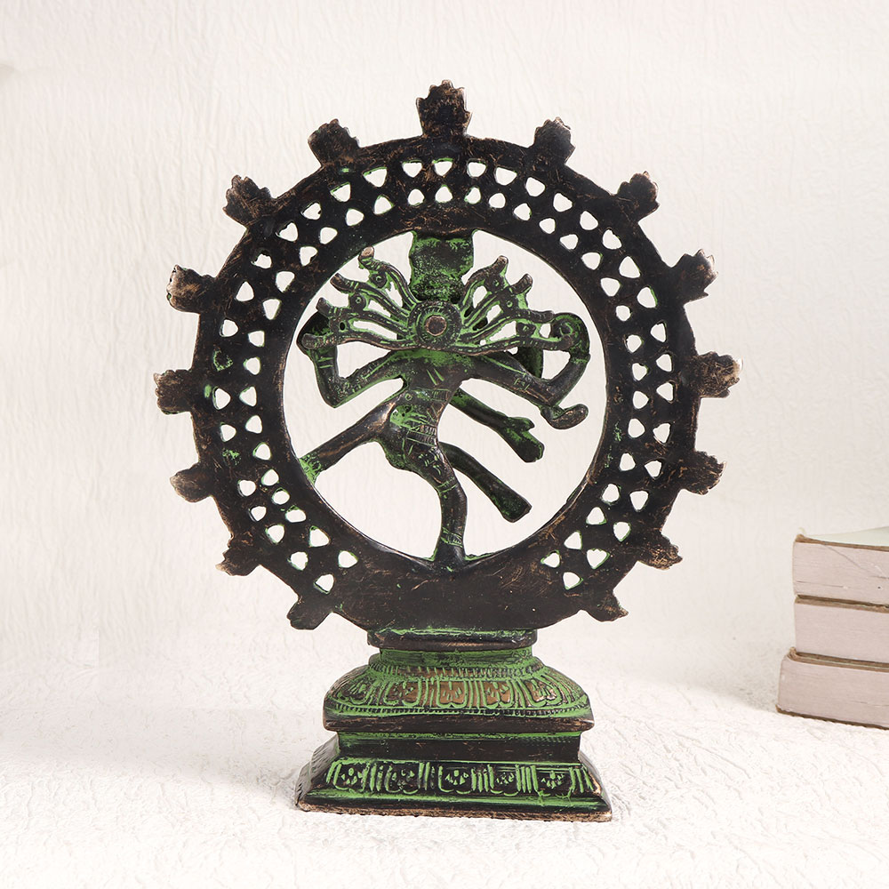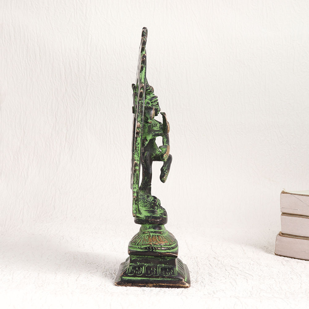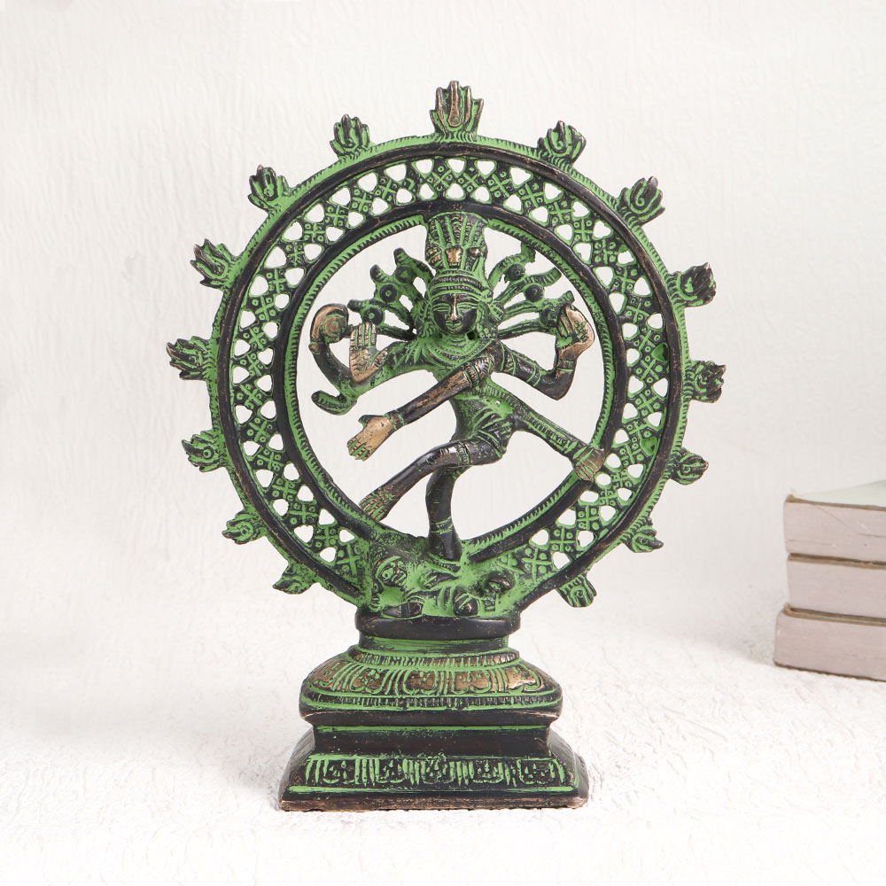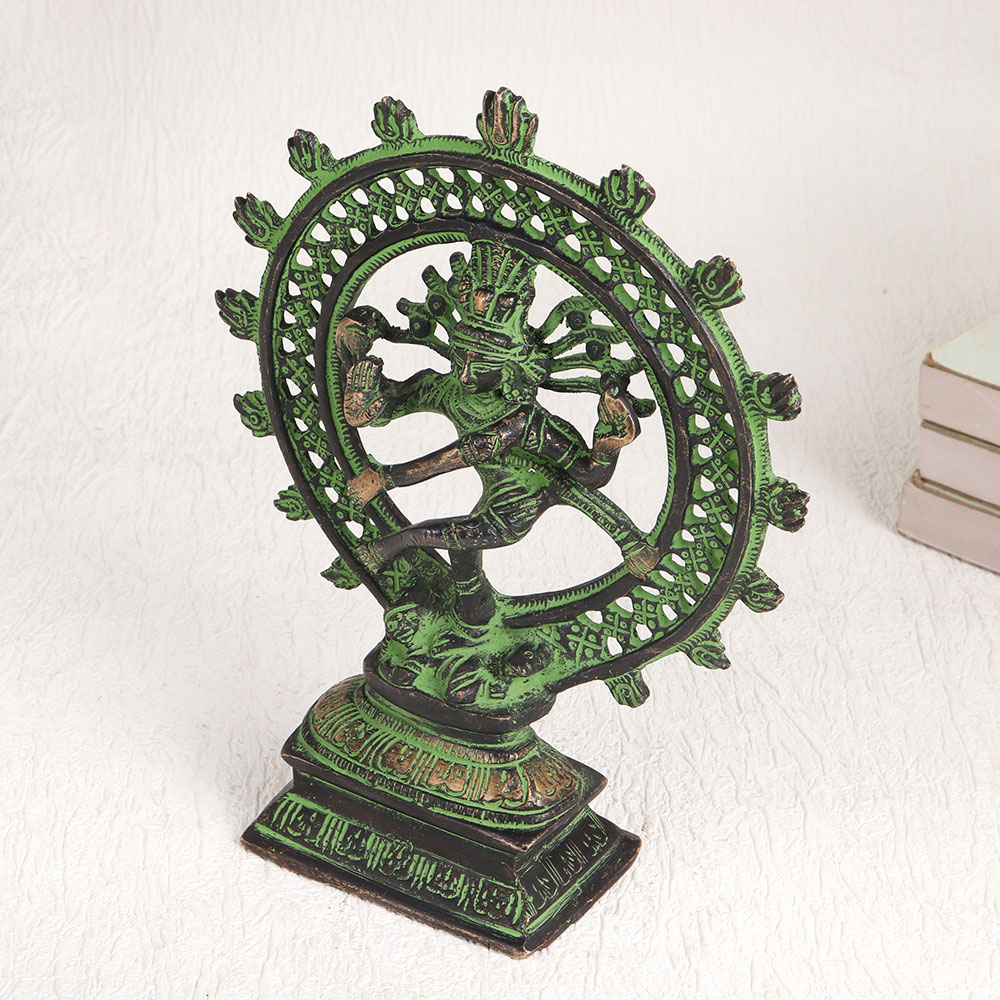 Enhance your space with the exquisite elegance of our brass statue depicting Natraja, the divine avatar of Lord Shiva. This captivating piece of artistry standing on a platform that beautifully captures the essence of Lord Shiva's cosmic dance known as the Tandava in an antique green and black finish. Crafted by highly talented Indian artisans, this masterpiece is a testament to their expertise and devotion. Handmade with meticulous attention to detail, this Natraja statue is fashioned from high-quality brass, ensuring its durability and timeless beauty. Versatile in its use, it can grace your home, office, restaurant, hotel, cafe, or shop, adding an aura of spirituality and sophistication to any space. Whether for worship or decoration, it exudes a sense of divinity and grace. This Natraja statue is also a treasure for collectors and can be a stunning addition to exhibitions. It makes for a thoughtful and meaningful gift for your family, friends or relatives on special, festive, or auspicious occasions, embodying the blessings and symbolism associated with Lord Shiva's divine dance. Embrace the artistry, spirituality, and craftsmanship of India with this remarkable creation.