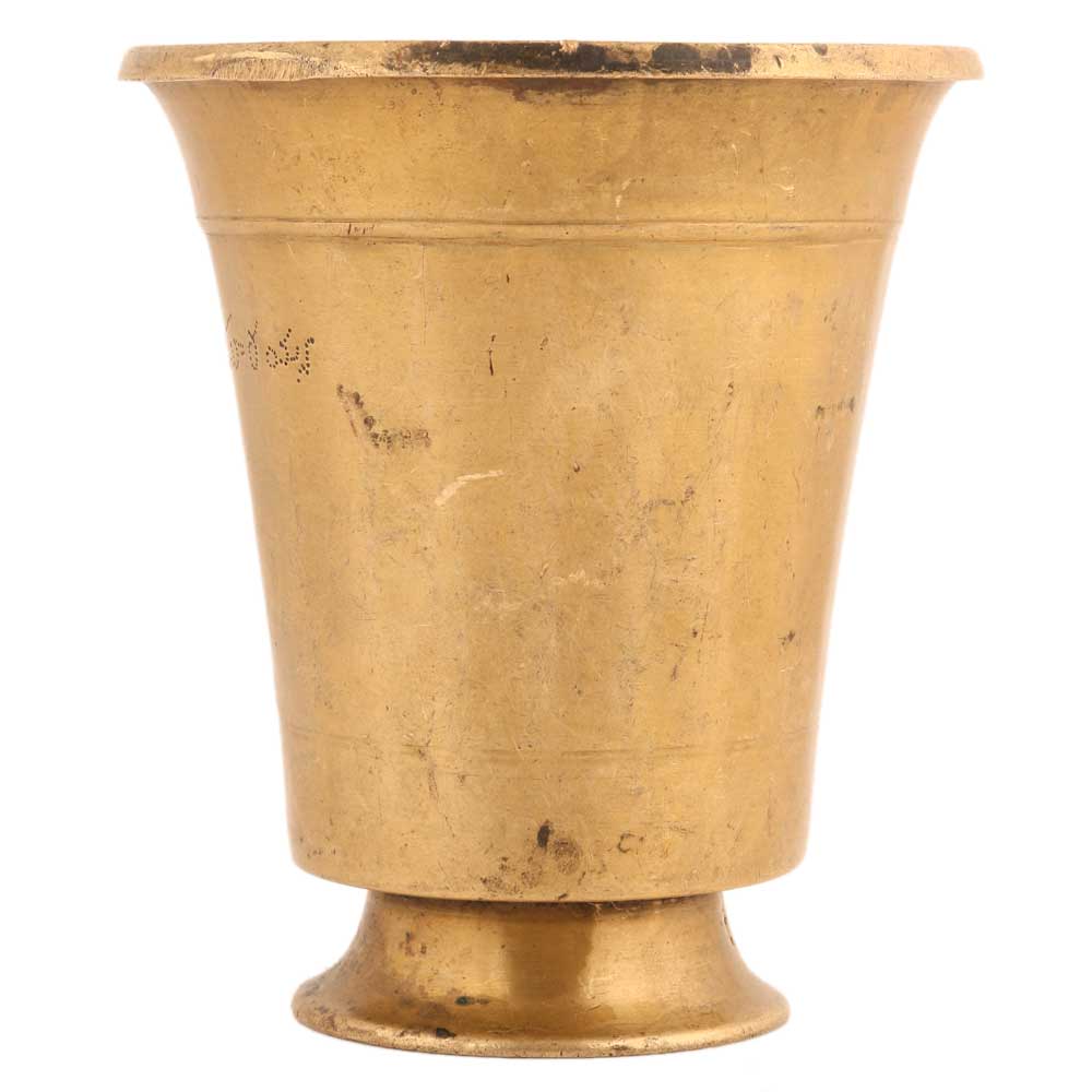 A golden brass tumbler on a cylindrical base for your house, school, or business, it may be used for kitchen decorating, table exhibition, pen stand, spoon stand, flower vase and study desk decor.