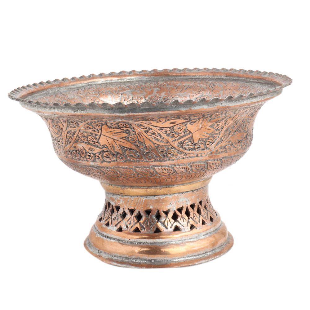 This handmade copper incense burner cup shape with embossed leaf pattern and curt work pattern in the base. It is excellent for home decoration, as anniversary and wedding gifts.
