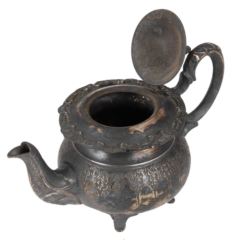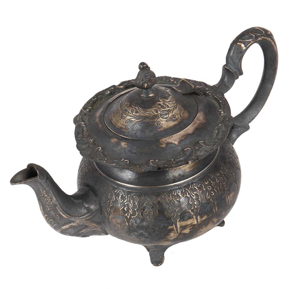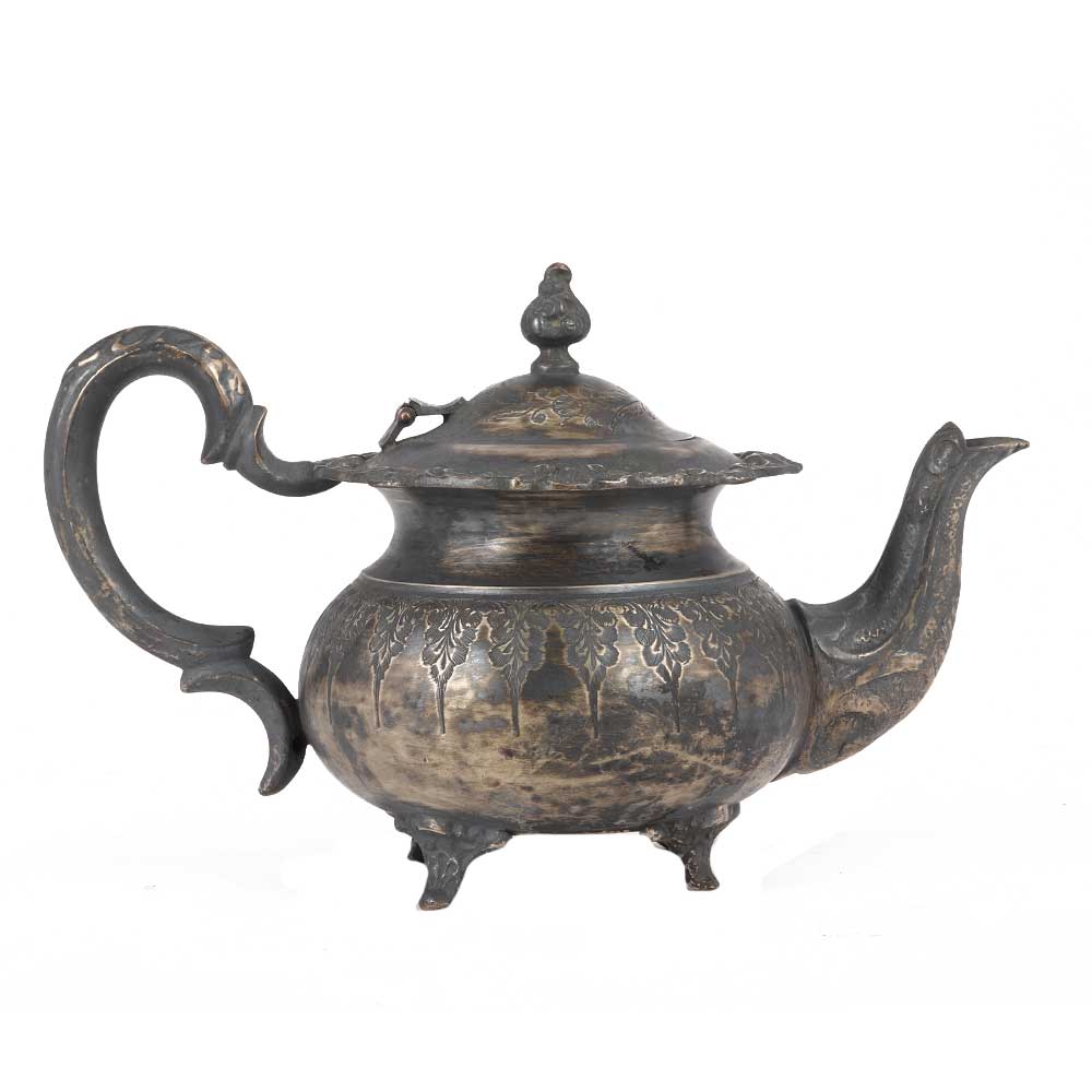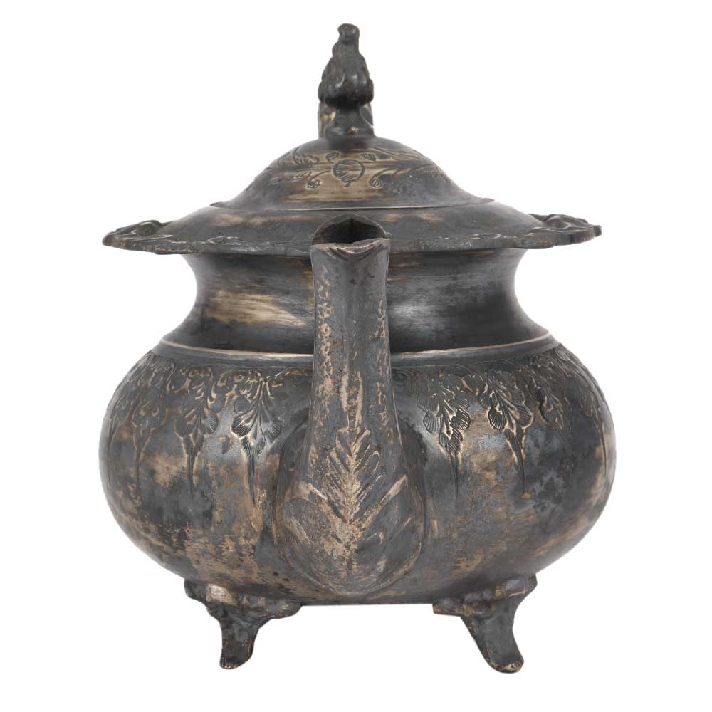The traditional ageless style of this oxidised silver brass teapot is elaborately etched with repousse floral and geometrical shapes. This one-of-a-kind item is created in the classic Moroccan style. This teapot can be used in a variety of settings.