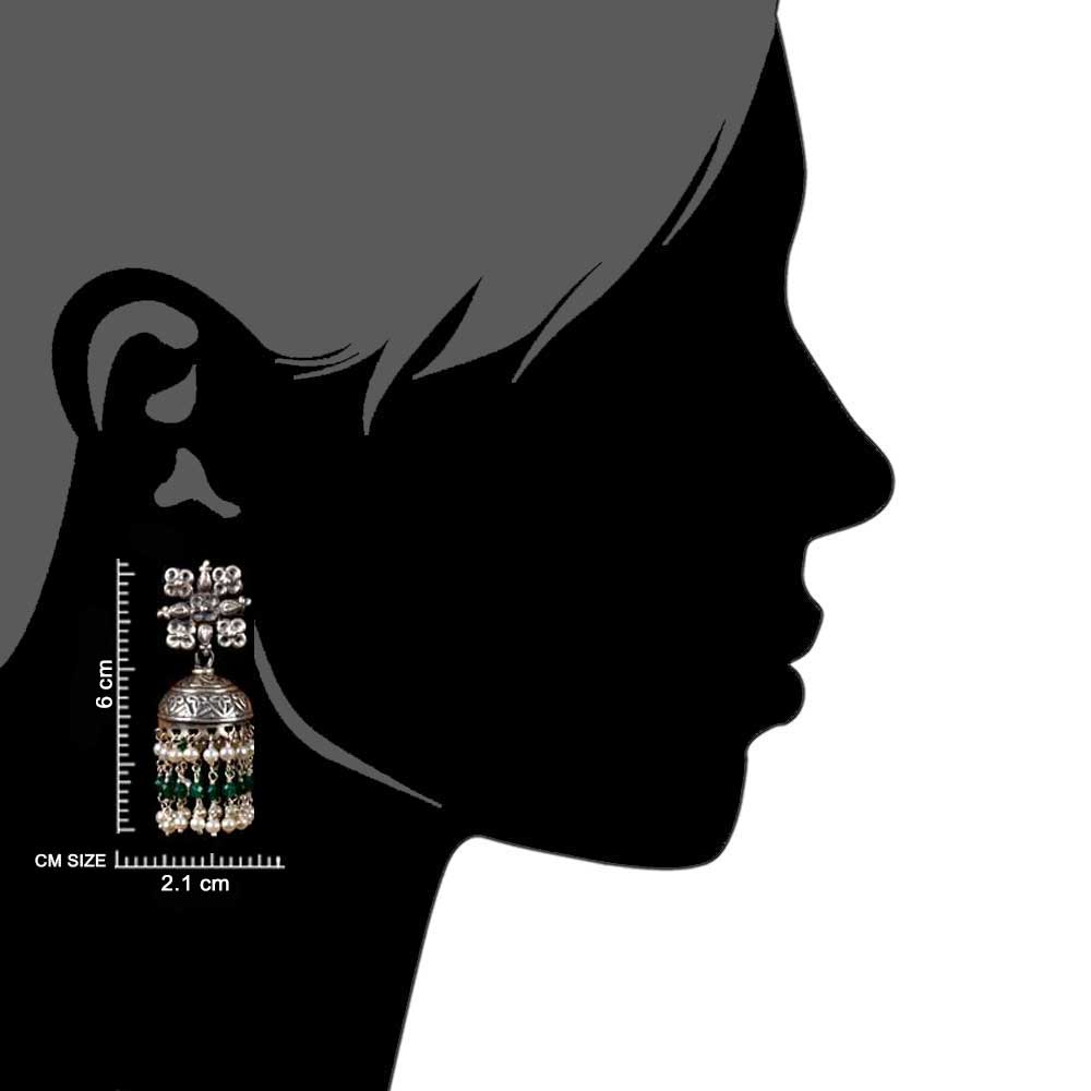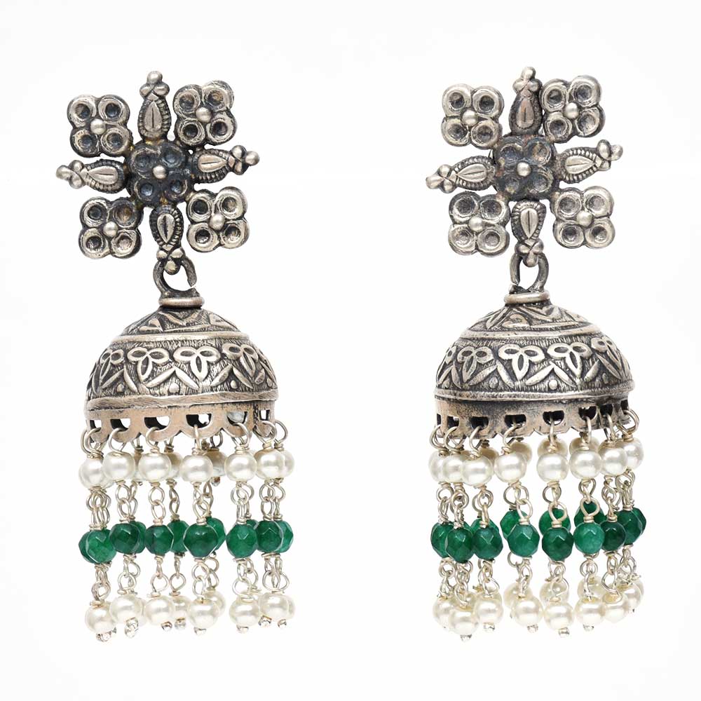 Oxidized silver floral earrings with emerald green bead Jhumkis earrings look dazzling and are very suitable for all kinds of elegant occasions. It is very suitable for weddings, ethnic and holiday parties.