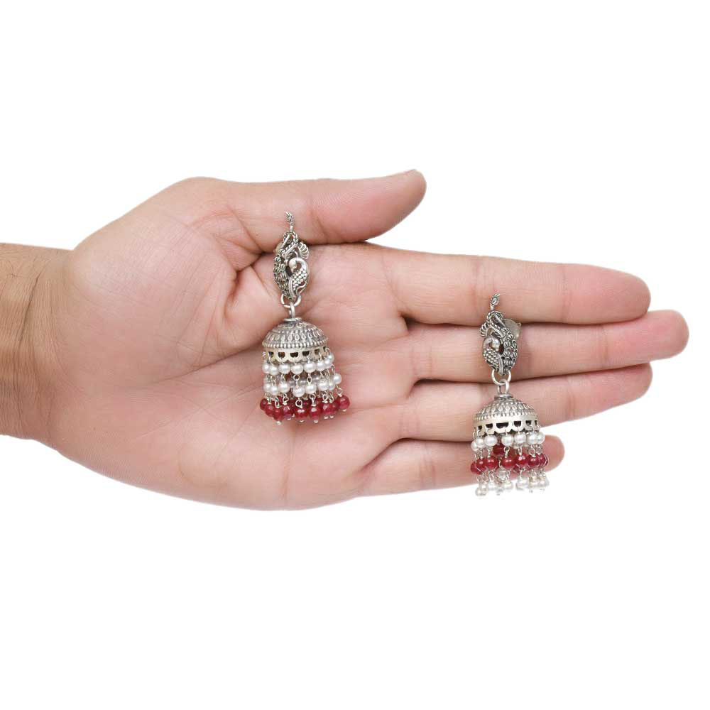 Handmade Oxidized Silver Peacock Jhumki Earrings with Stones looks stunning and is preciously suitable for all kinds of dressy occasions like Weddings and receptions also the perfect festive party wear.