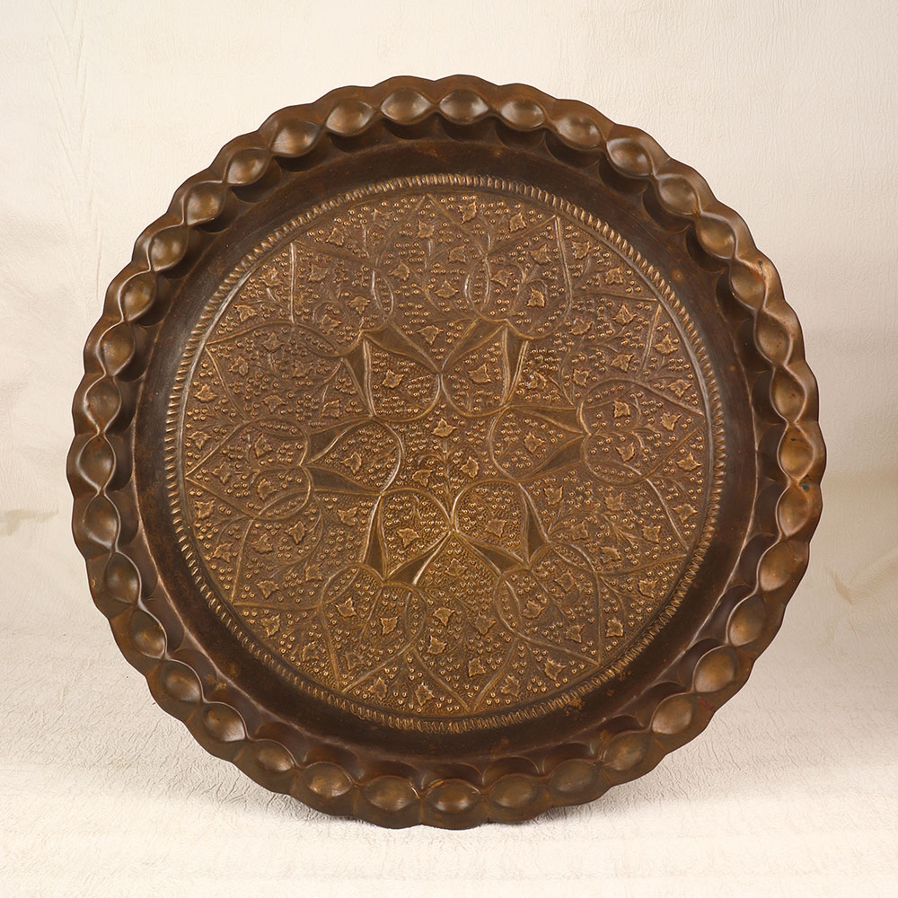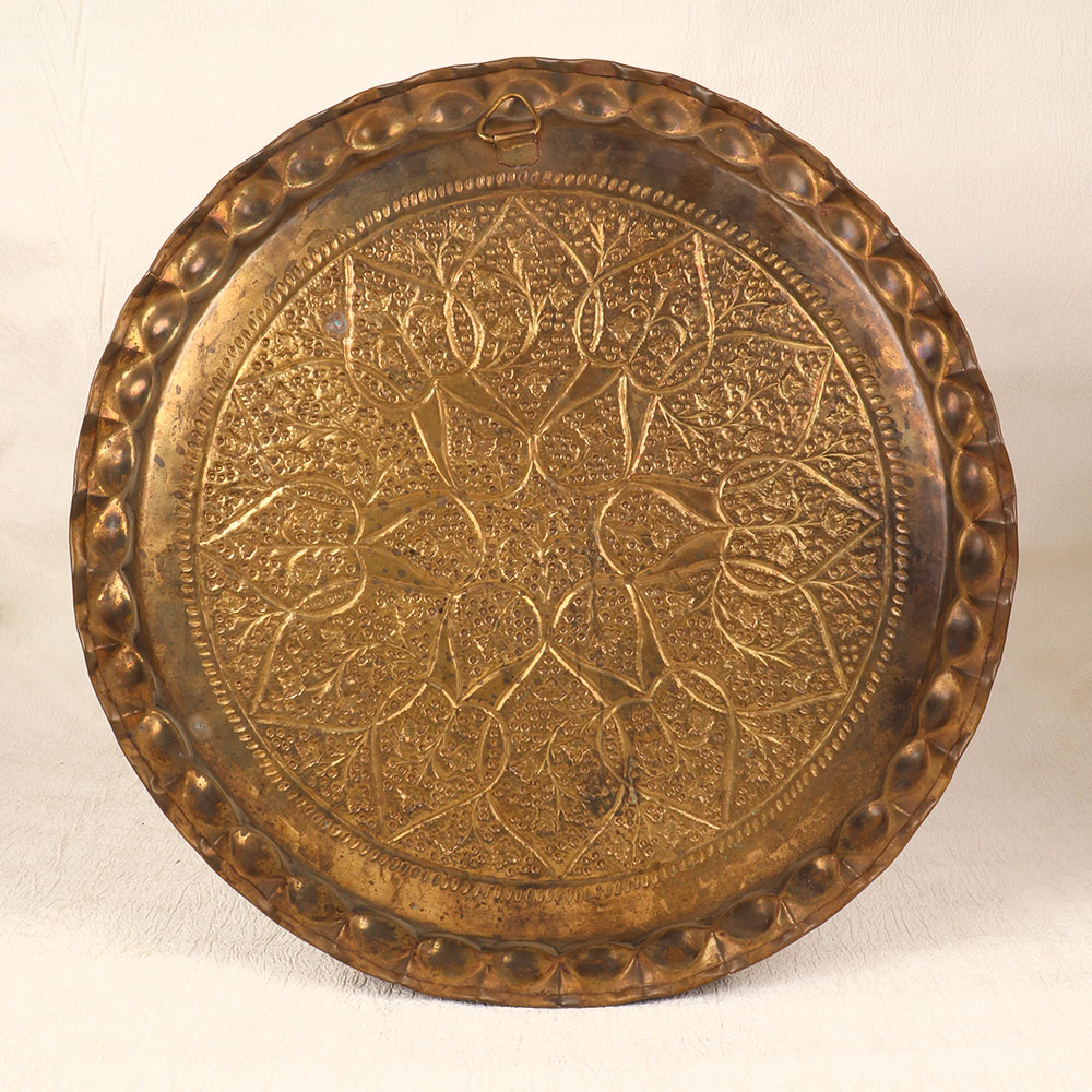 Add Character and Charm with This Timeless Vintage Brass Plate This striking vintage brass plate will infuse your home with antique-inspired style and character. The intricate floral engraving encircles the plate's surface, showcasing the artistry of times past. With its vintage brass finish and visible wear that comes from decades of existence, this plate has an authentic aged quality you just can't find in reproductions. At 18 inches in diameter, this substantial brass plate commands attention when hung on your wall. The vintage brass plate is crafted from durable, heavy-gauge metal that provides stability and allows for secure mounting on your wall. Display it as a standalone focal point or group it with other plates for a collection of old-world allure. Let this brass beauty transport you back in time while complementing both traditional and modern spaces.