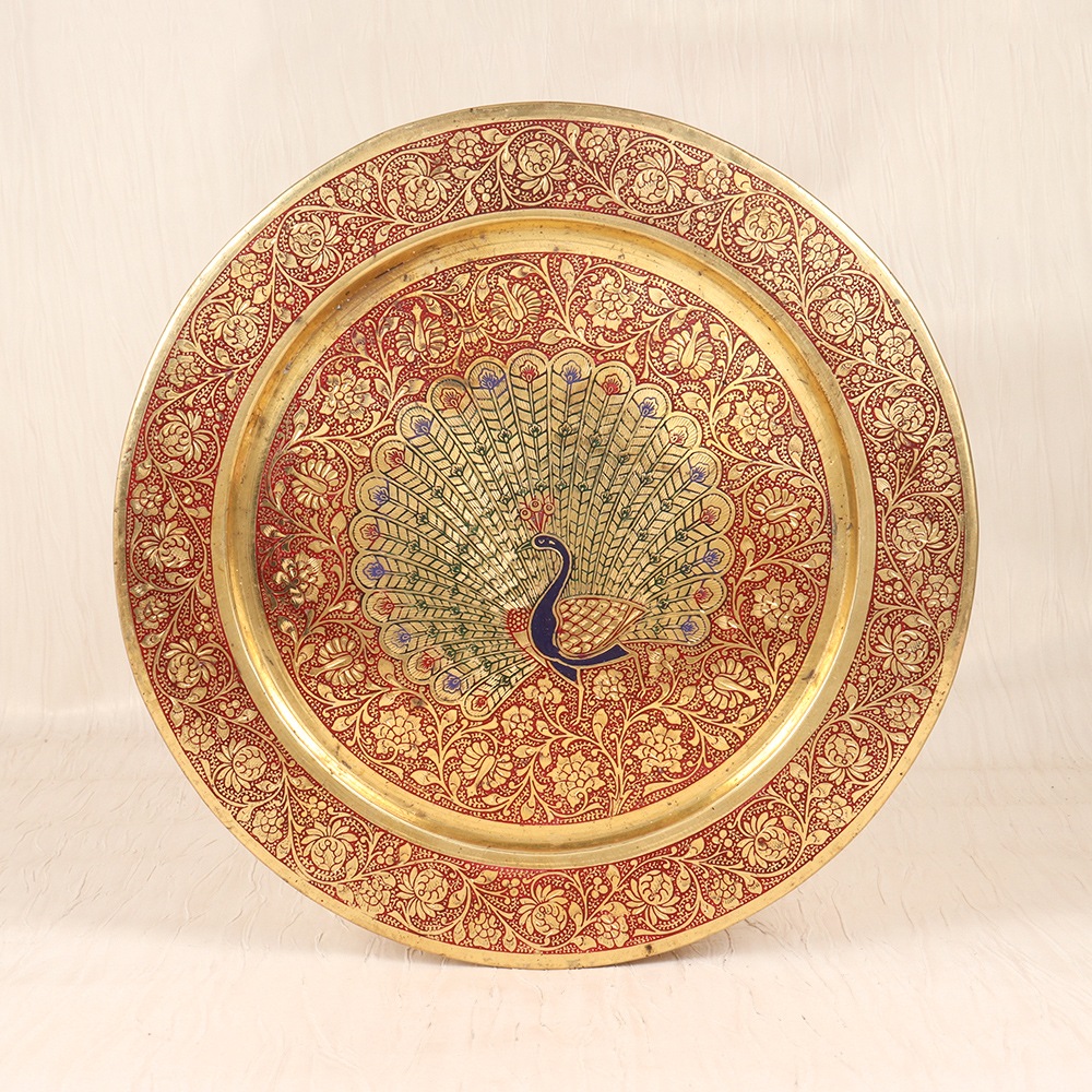 Journey back in time with the Vintage Brass Peacock Plate - a stunning work of art that celebrates the intricate craftsmanship of the past. Meticulously handcrafted from solid brass, this captivating plate features a breathtaking peacock design engraved and enameled in vibrant shades of red and blue. Imagine this plate gracing the walls of a grand manor or adorning the shelves of an antique shop. Its timeless elegance and old-world charm will transport you to a bygone era, evoking feelings of nostalgia and wonder. Whether you're drawn to vintage aesthetics or simply appreciate fine craftsmanship, this plate is sure to captivate and delight. Elevate your space with the Vintage Brass Peacock Plate and surround yourself with the beauty of the past. This stunning piece will become a treasured heirloom, passed down through generations and admired for its exceptional quality and enduring appeal. Embrace the charm of yesteryear and let this plate inspire you to create a home filled with timeless elegance.