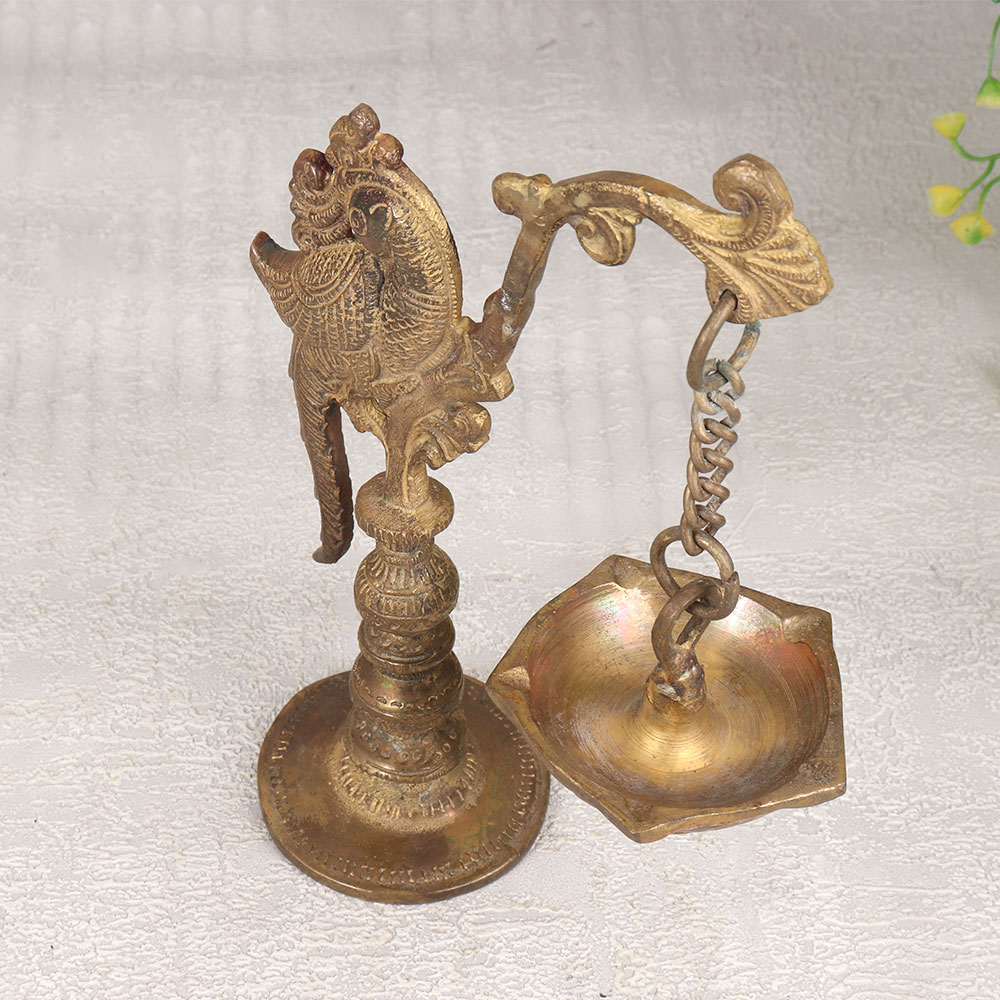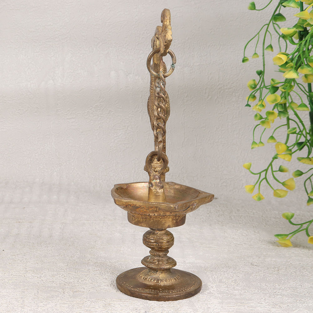A Brass Peacock Oil Lamp that is a timeless masterpiece handcrafted by highly skilled Indian artisans. The lamp features a stunning antique brown finish, highlighting the intricate details of the majestic peacock design. Made from high-quality brass, this piece radiates authenticity and charm. The lamp is designed to hold five Jyots, providing a warm and inviting glow when lit with mustard oil or ghee using cotton wicks. This traditional lighting method adds a touch of heritage to any space. Whether placed at home, in an office, restaurant, hotel, or cafe, this lamp serves as a symbol of cultural richness and elegance, enhancing the ambiance with its regal presence. Not just a piece of decor, the Brass Peacock Oil Lamp is a thoughtful gift for your family, friends or relatives on special, festive, or auspicious occasions. Share the beauty of Indian craftsmanship and traditions with this unique and meaningful present, a symbol of warmth, light, and enduring craftsmanship. Elevate your surroundings and celebrate the artistry of Indian culture with this exceptional brass oil lamp.