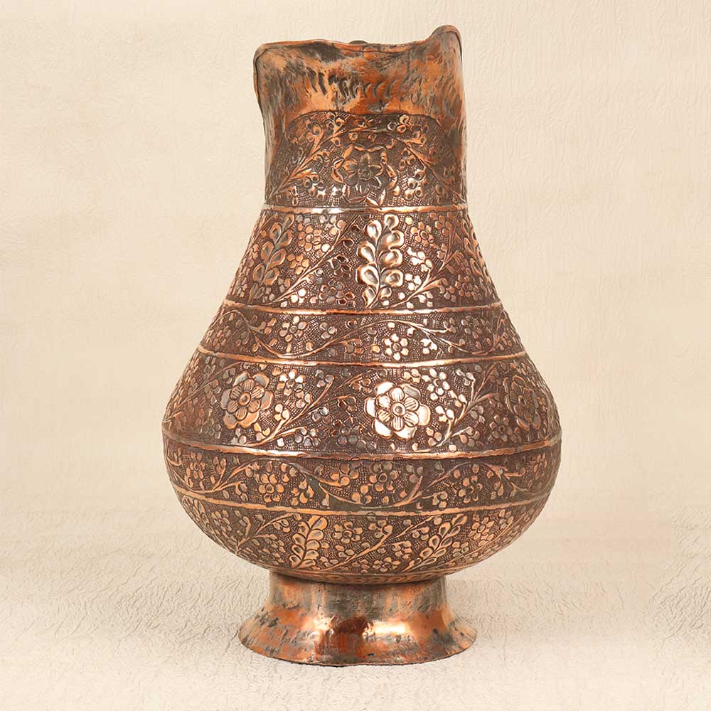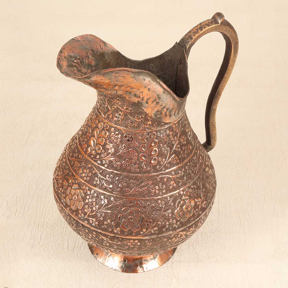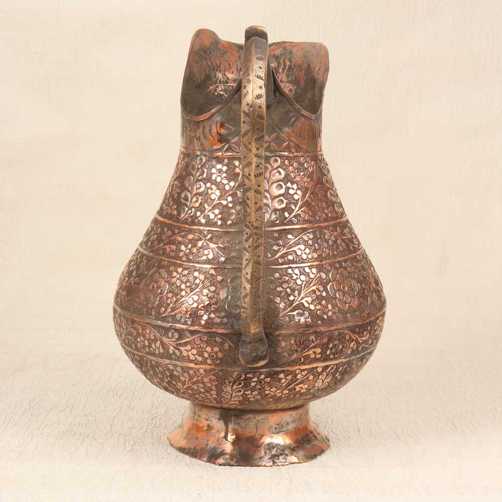 Make a stunning statement with this antique copper Islamic art jug featuring intricate engraved patterns and motifs. This gorgeous jug reflects the mesmerizing beauty of Islamic design passed down through generations of skilled artisans. Bring the richness of Islamic art into your home with this regal jug. Its ornate details and antique patina make a sophisticated addition to any drinkware collection or tablescape. Perfect for adding an exotic global element to your decor, this Islamic jug stuns with its intricate engraving and spout for pouring drinks with flair. Make your home a showcase for this Islamic treasure.