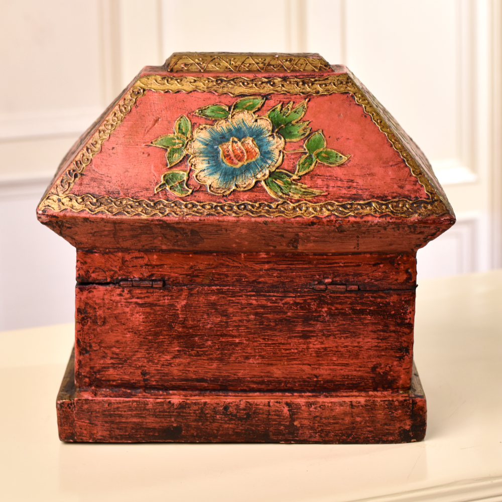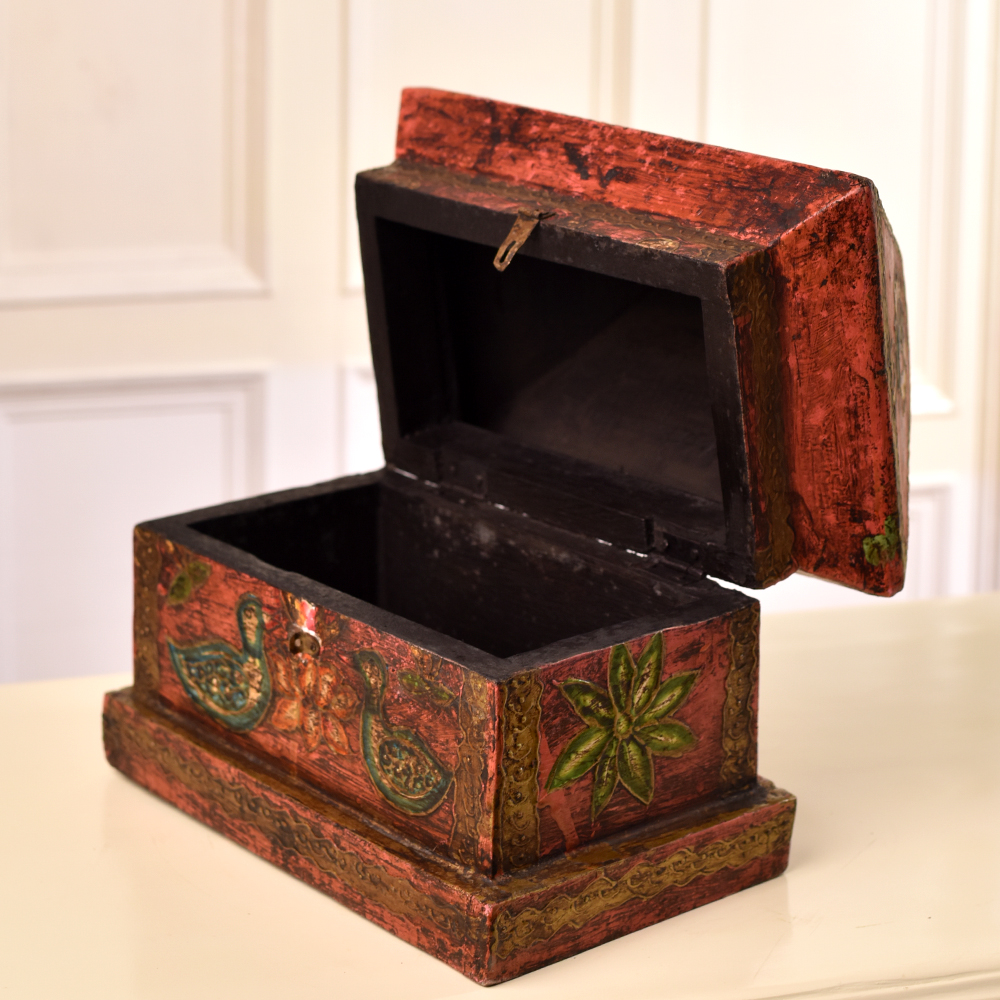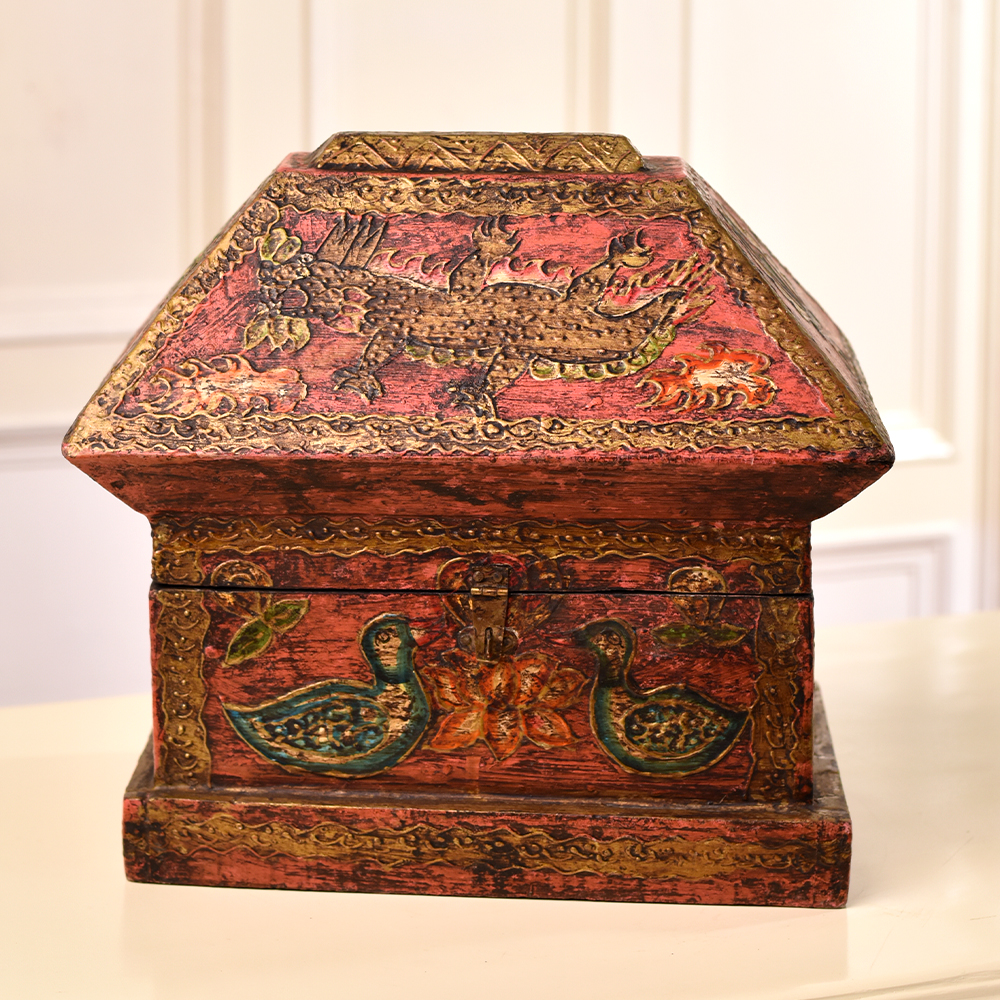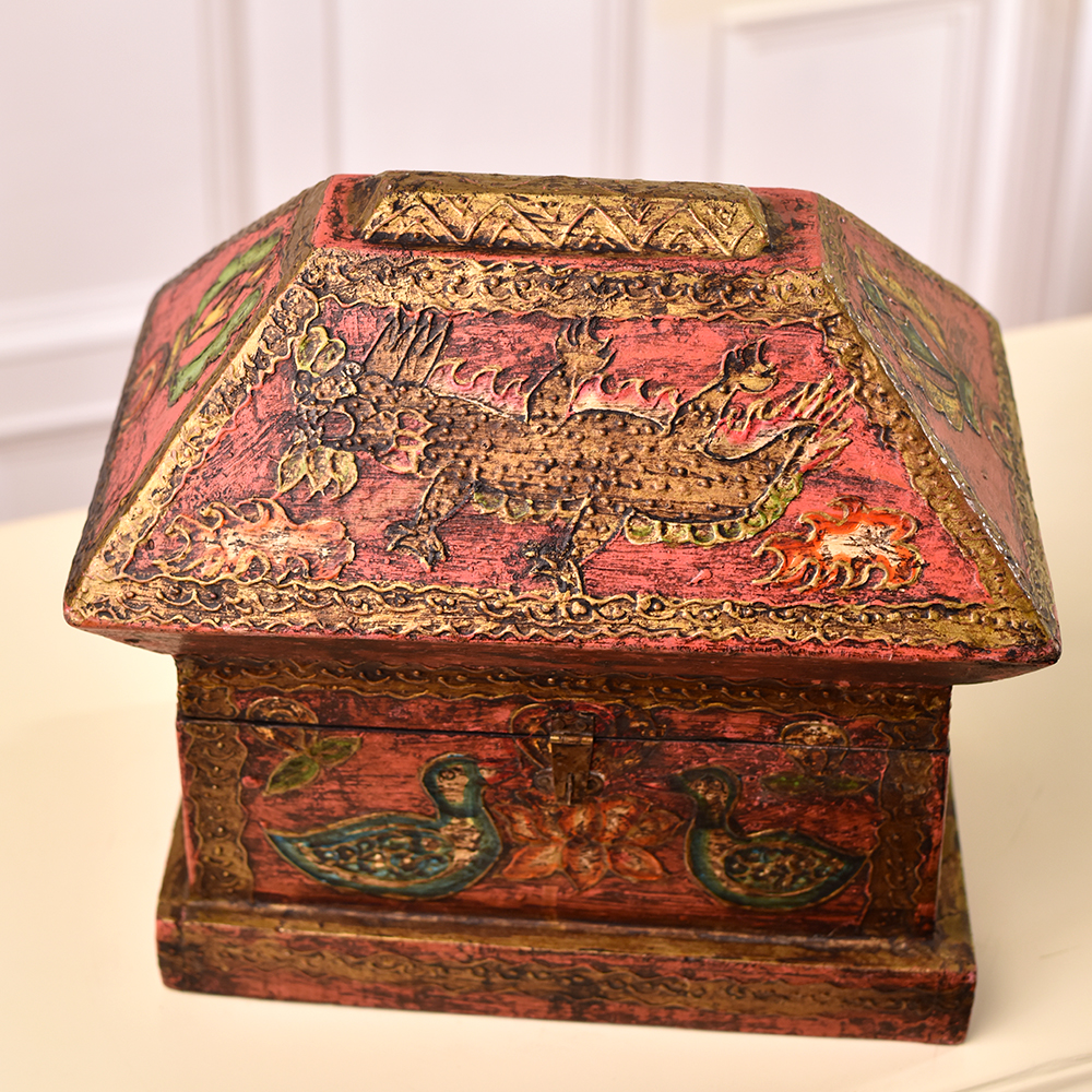 Elegance meets craftsmanship in this exquisite wooden box adorned with captivating dragon and bird engravings. Handmade by skilled Indian artisans, each detail reflects their mastery and dedication. The antique brown finish adds a touch of timeless sophistication, making it a perfect accessory for your cherished jewelry or any small, precious items. With a secure latch, this box ensures both practicality and charm. Its high-quality wood not only guarantees durability but also showcases the rich cultural heritage embedded in every inch. Versatile in its use, it's a functional jewelry box and a stylish storage solution for trinkets. Its beauty isn't confined to your personal space, this box is a conversation starter, fitting seamlessly into exhibitions or displays. Surprise your family, friends or relatives with a gift that transcends time - an embodiment of artistry and tradition. Whether it's a special occasion or a festive celebration, this antique treasure promises to captivate hearts and stand as a symbol of enduring craftsmanship.