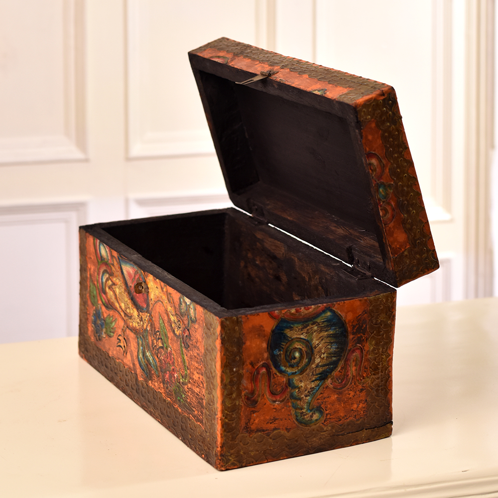 Buy a rectangular wooden box online which is a masterpiece crafted by talented Indian artisans. This handmade marvel is crafted from high-quality wood, showcasing the artisan’s dedication to their craft. Adorned with intricate floral engravings, each box is a unique canvas of vibrant hues, making it a multi-coloured delight. Equipped with a secure latch, this versatile box is perfect for safeguarding your cherished jewelry and small treasures. Its functionality seamlessly blends with aesthetic appeal, making it a statement piece worthy of display at exhibitions or in your personal space. Gift a piece of Indian craftsmanship to your family, friends or relatives on special or festive occasions, letting them unwrap not just a box, but a story of artistry and tradition. Embrace the fusion of utility and beauty with this charming wooden box, a testament to the timeless skill and creativity of Indian artisans.