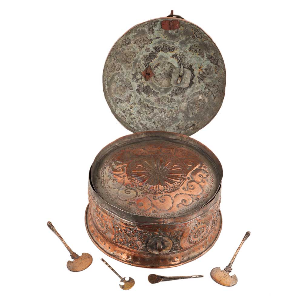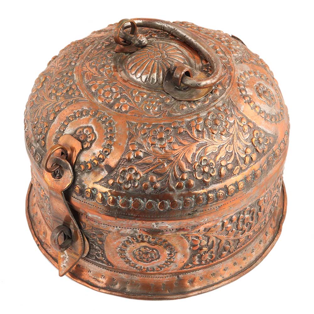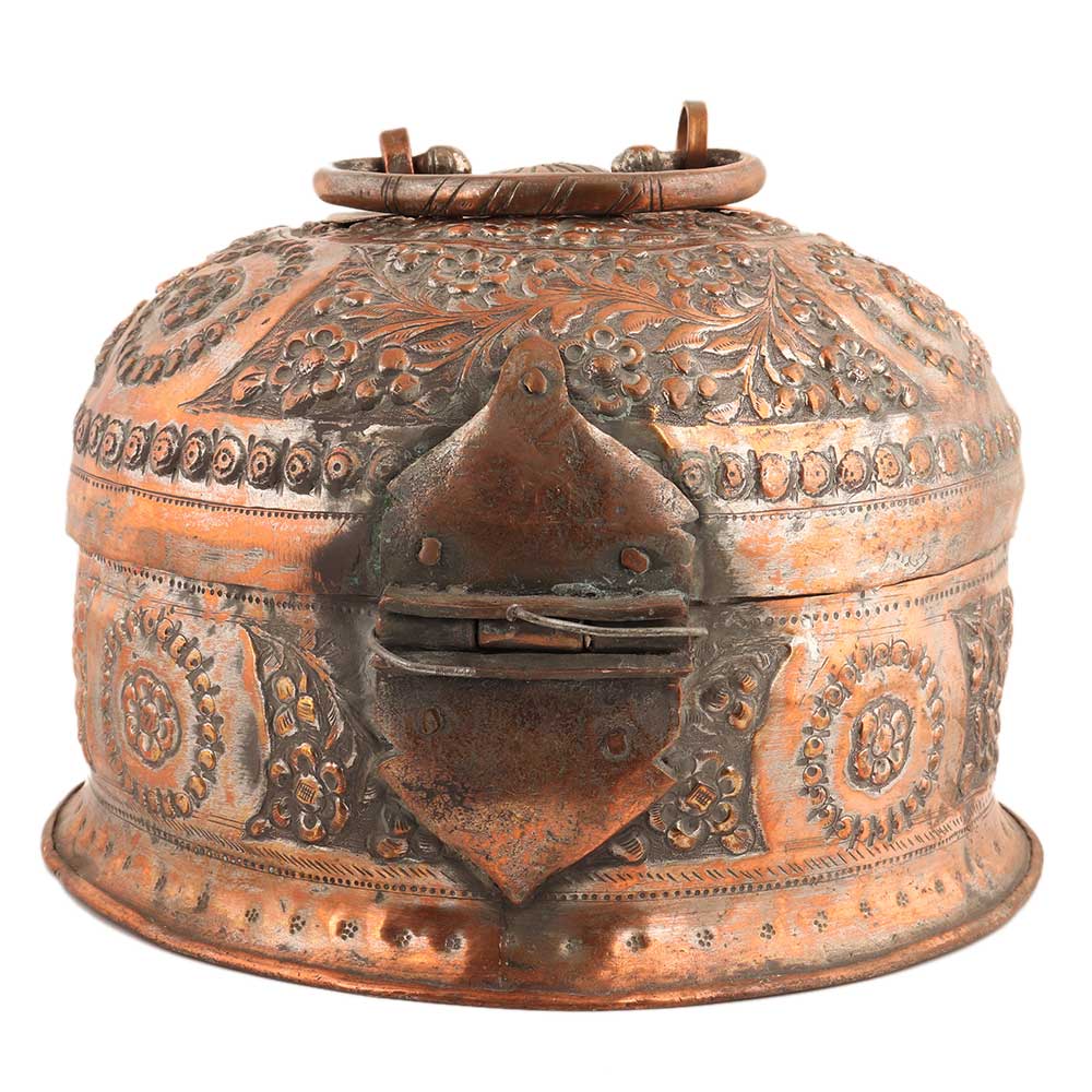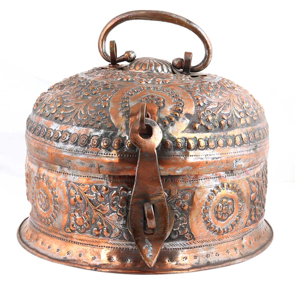 Well crafted hyderabadi copper storage box or jewelry box with lovely embossed design of leaves and flowers. Use it as a wedding , anniversary or house warming gift for relatives and friends.