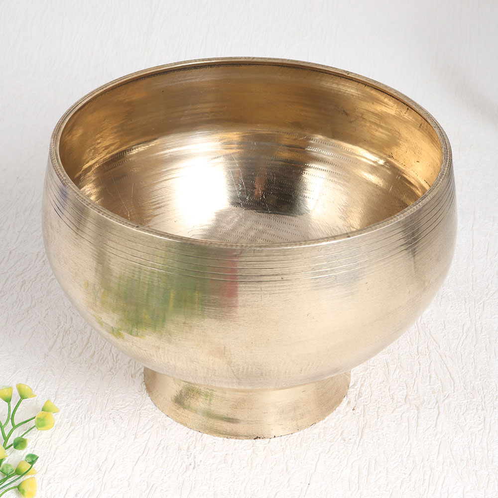 Adorn your decor with the timeless elegance of this exquisite vintage brass bowl that is lovingly handcrafted by professional Indian artisans hailing from the scenic Himachal Pradesh region. Crafted with precision and passion, this bowl boasts a stunning shiny golden finish that exudes opulence and sophistication. Made from top-notch brass, this artisanal masterpiece is more than just a mere home accessory, it's a work of art that transcends time and trends. Its versatility knows no bounds, making it a splendid addition to any setting, be it your home, office, restaurant, hotel, cafe, or shop. Embrace creativity as you use this brass bowl to showcase your favourite blooms, transforming it into a unique and charming flower pot. It's not just a decoration piece, it's a conversation starter, a testament to your refined taste and appreciation for heritage craftsmanship. This vintage brass bowl is the perfect addition to your collection of timeless treasures or an enchanting exhibit piece. Moreover, it makes for an exceptional gift to celebrate special, festive, or auspicious occasions, sharing the warmth and beauty of Indian craftsmanship with your family, friends or relatives. Acquire this remarkable piece today and let its golden allure infuse your surroundings with a touch of regal grandeur.