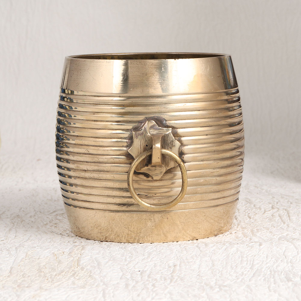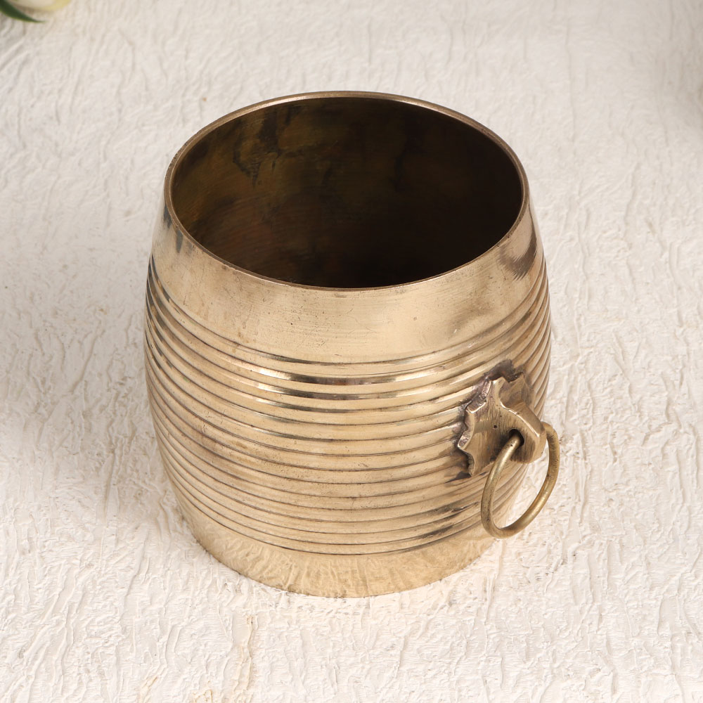 Enhance your home interior with the exquisite craftsmanship of South Indian Art that is embodied in our captivating Drum-Shaped Brass Measurement Pot. Handcrafted by highly skilled Indian artisans, this stunning piece is a testament to their centuries-old expertise and dedication to perfection. Made from premium-quality brass, this pot boasts a radiant golden finish that is nothing short of enchanting. Its two elegantly crafted handles add to its charm, making it not just a piece of decor but a work of art. The intricate engravings on the surface tell a story of culture and tradition, making it a conversation starter in any setting. Place it in your home, office, restaurant, hotel, cafe, or shop to infuse a touch of opulence and heritage into the ambiance. This versatile piece also complements vintage collections, adding a timeless allure. With its awe-inspiring aesthetics, it makes for a thoughtful gift on special, festive, or auspicious occasions. Embrace the rich heritage of South Indian Art with this brass measurement pot, a symbol of beauty and craftsmanship.