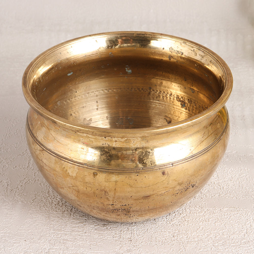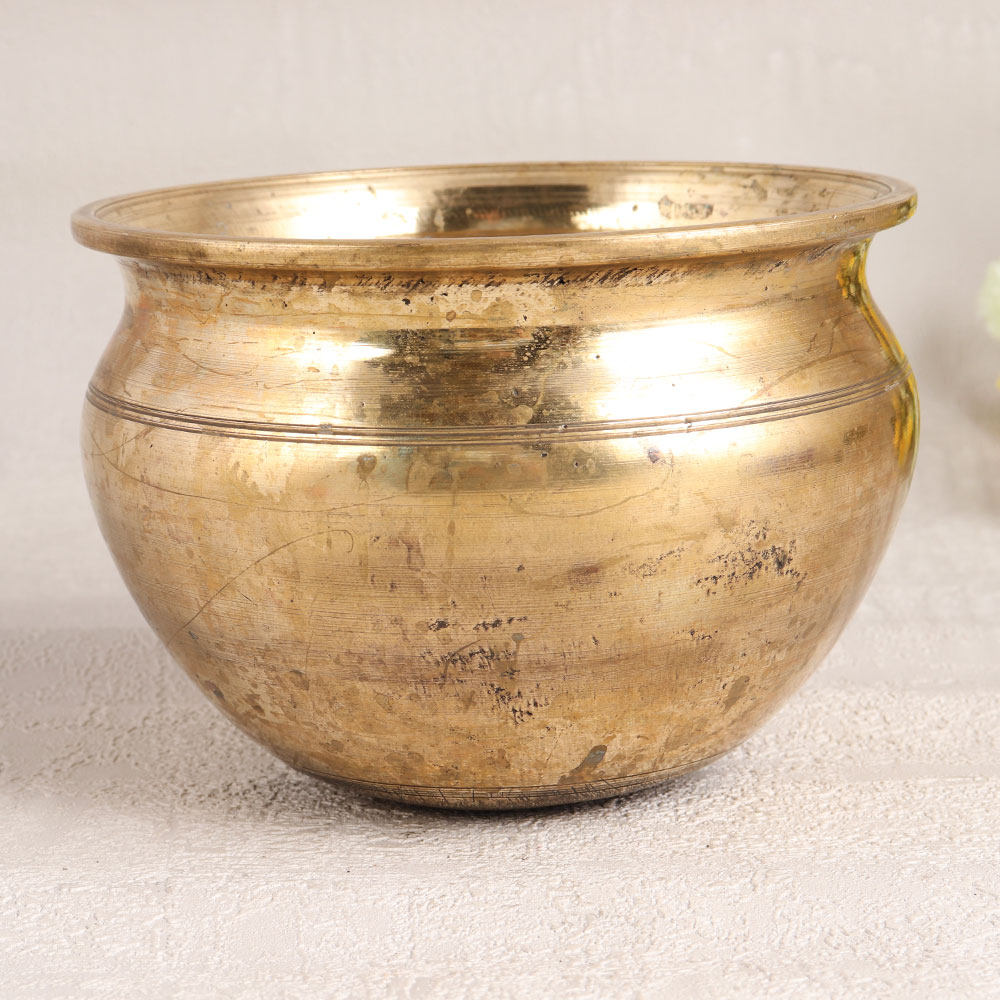 A Vintage Brass Holy Pot with its exquisite antique brown finish is a testament to the craftsmanship of skilled Indian artisans. Handmade with precision and love, this holy pot exudes an aura of spirituality and elegance. Crafted from high-quality brass, this sacred piece is a versatile addition to your surroundings. Place it in your home, office, hotel, cafe, shop, or restaurant prayer room, and let its presence infuse a sense of serenity into your space. It serves a dual purpose, not only as a symbolic piece for prayer but also as a unique small flower pot, enhancing the aesthetics of your environment. This antique brass creation can also find a cherished spot in your vintage collection, perhaps even gracing the shelves of an exhibition. As a gift, it holds a special place in our hearts, making it a perfect choice for your family, friends or relatives on special, festive, or auspicious occasions. With its timeless appeal, our Vintage Brass Holy Pot is a treasure that connects the past with the present, creating a lasting legacy.