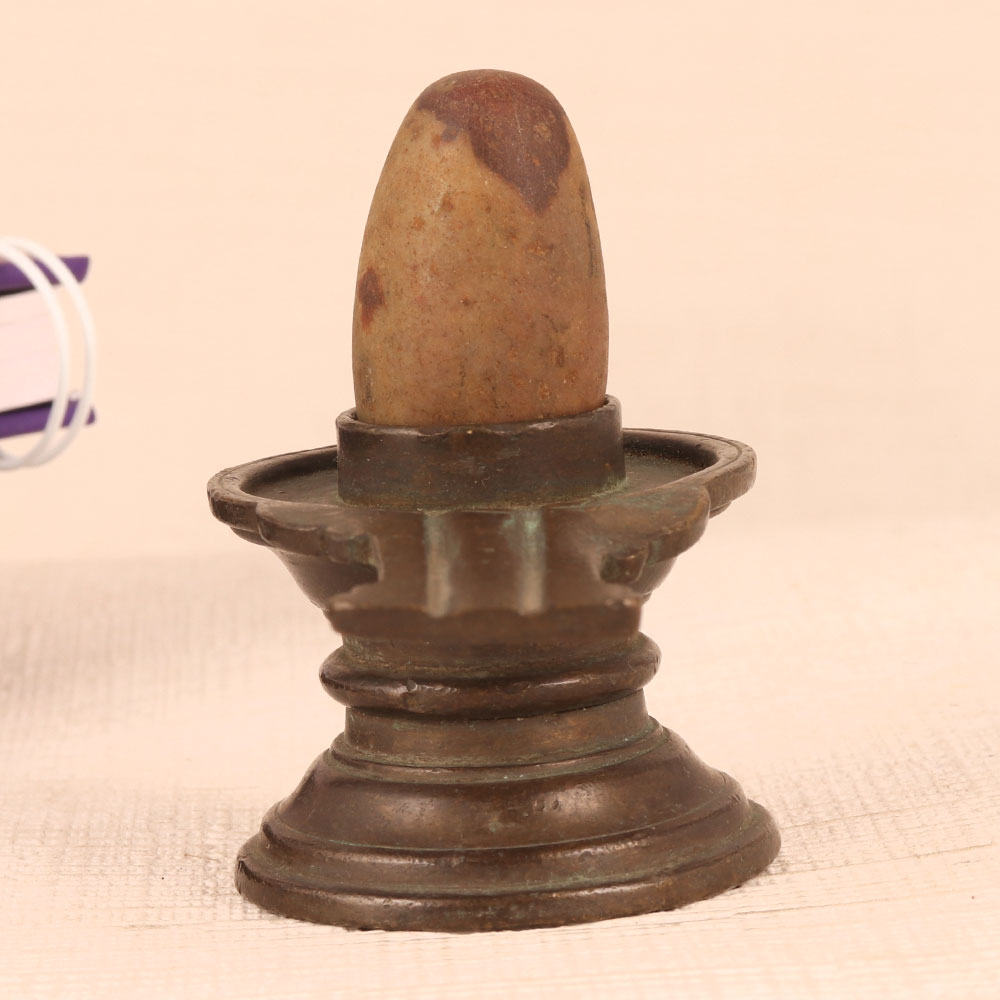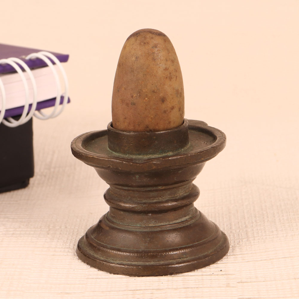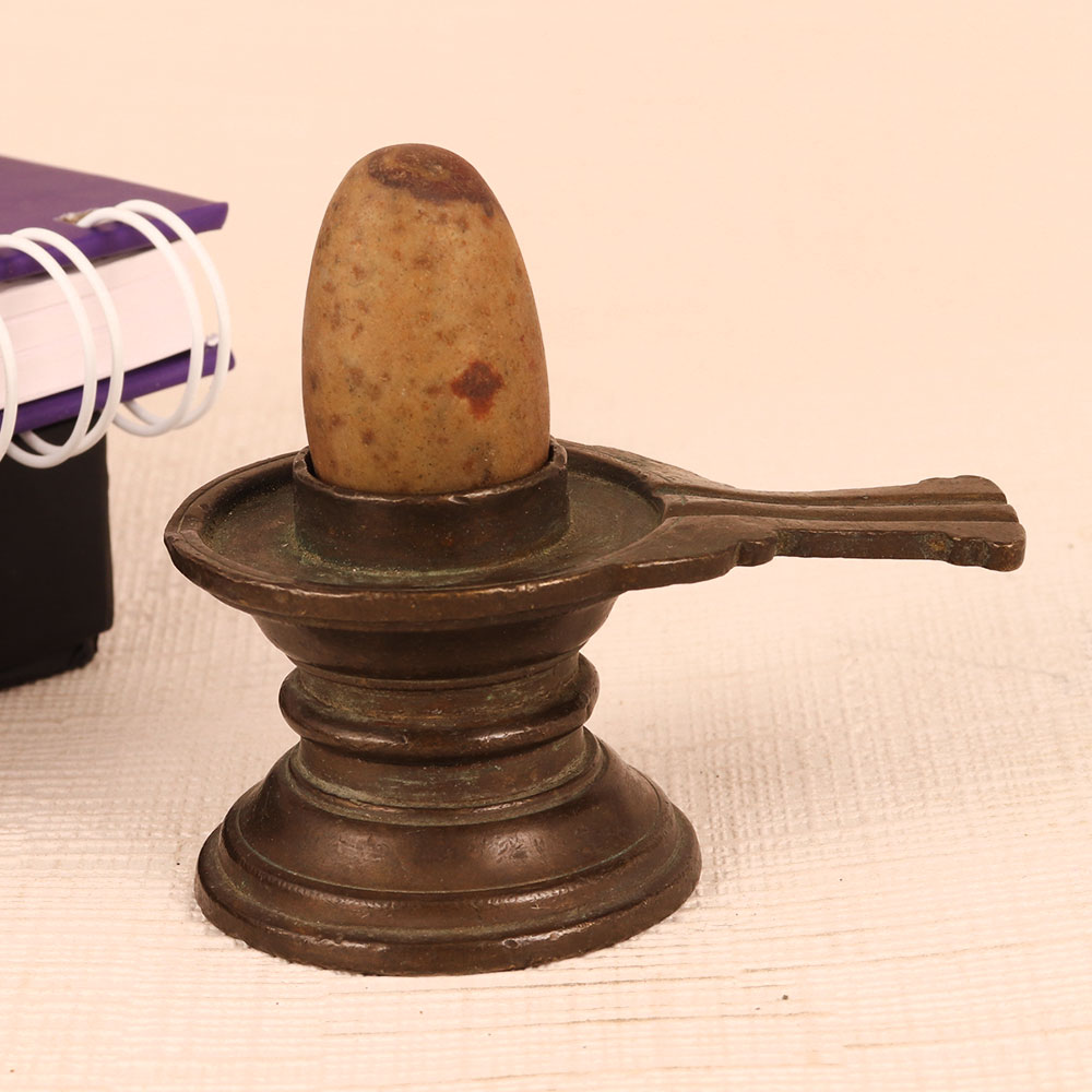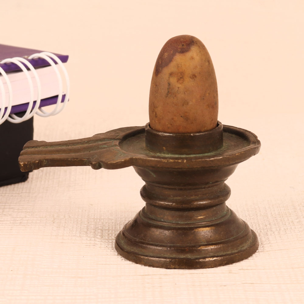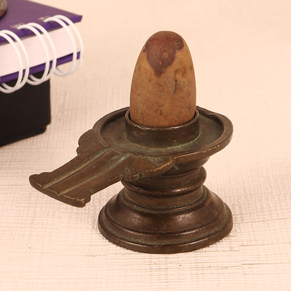 Buy a small Shivling with a brass Yoni and stone Lingam in an antique brown finish that is a sacred fusion of artistry and spirituality. Crafted with precision by highly skilled and experienced Indian artisans, this exquisite piece reflects their unwavering dedication to their craft. The Lingam carved from stone exudes an aura of ancient mysticism, symbolizing Lord Shiva's presence and divine energy. The meticulously crafted brass Yoni complements the Lingam, providing a harmonious pedestal for worship and contemplation. Perfect for any setting, whether at home, office, restaurant, hotel, cafe, or shop prayer room, this Shivling serves both as an object of devotion and a decorative statement. Its antique brown finish adds an air of authenticity, making it a striking addition to any space. For collectors of vintage and spiritual artefacts, this Shivling is a prized possession, blending aesthetics with spirituality. It evokes a sense of timeless grace and reverence. Furthermore, this Shivling makes for a thoughtful gift on special, festive, or auspicious occasions, conveying your deepest blessings and love to your family, friends or relatives. Bring a piece of divine serenity into your life with our small Shivling, where artistry meets spirituality in perfect harmony.