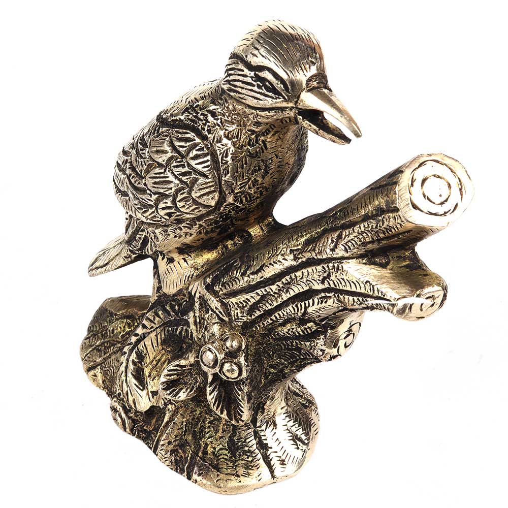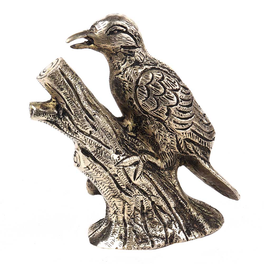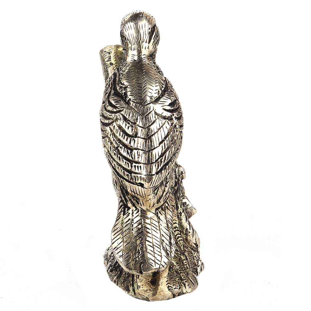 An impressive silver finish Bird model figurine statue perched on a branch extended from a chased round base. The Parrot is created with a wonderful attention finish brass to detail.