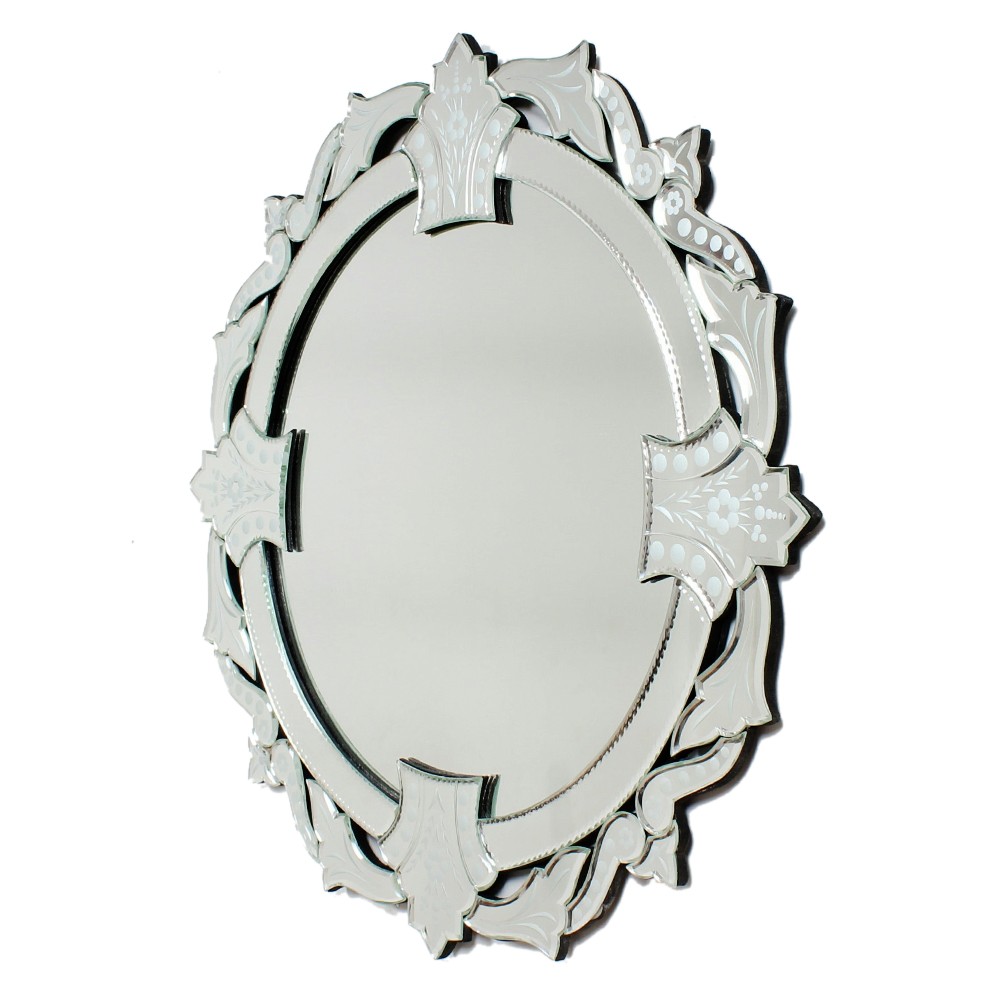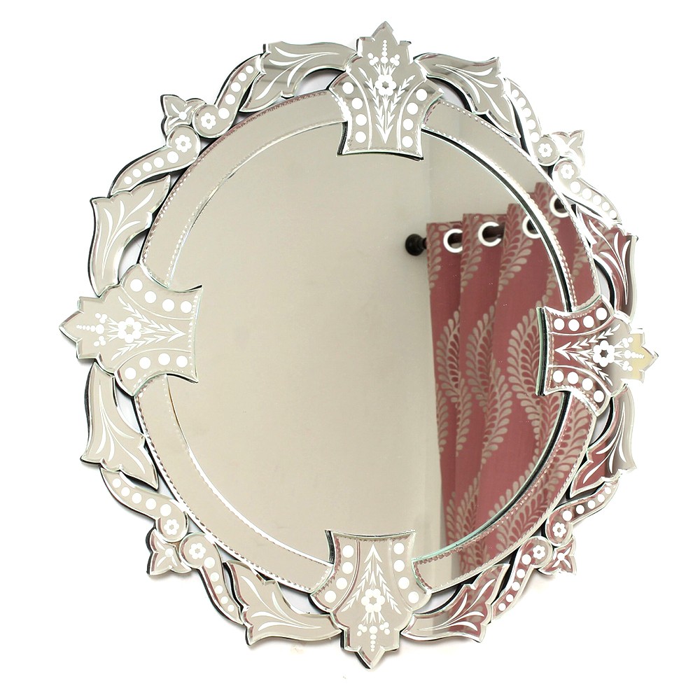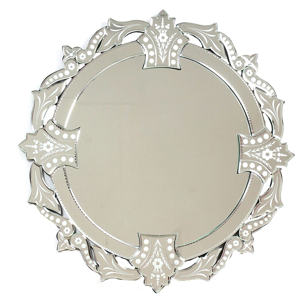 This decorative round mirror uses decorative engraving that is such a popular element in Venetian mirrors, surrounded by heavy scrolls and leaf-shaped frames, making it a magnificent wall mirror, perfect for any space.