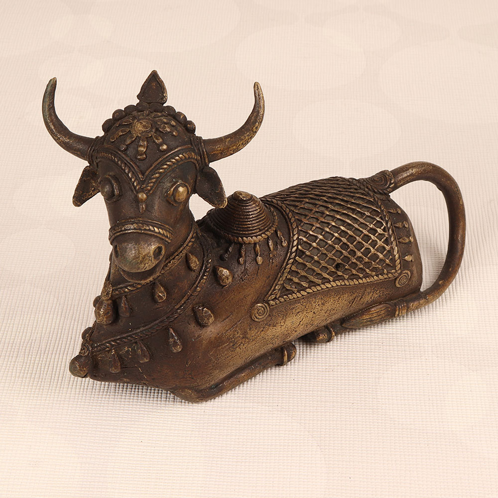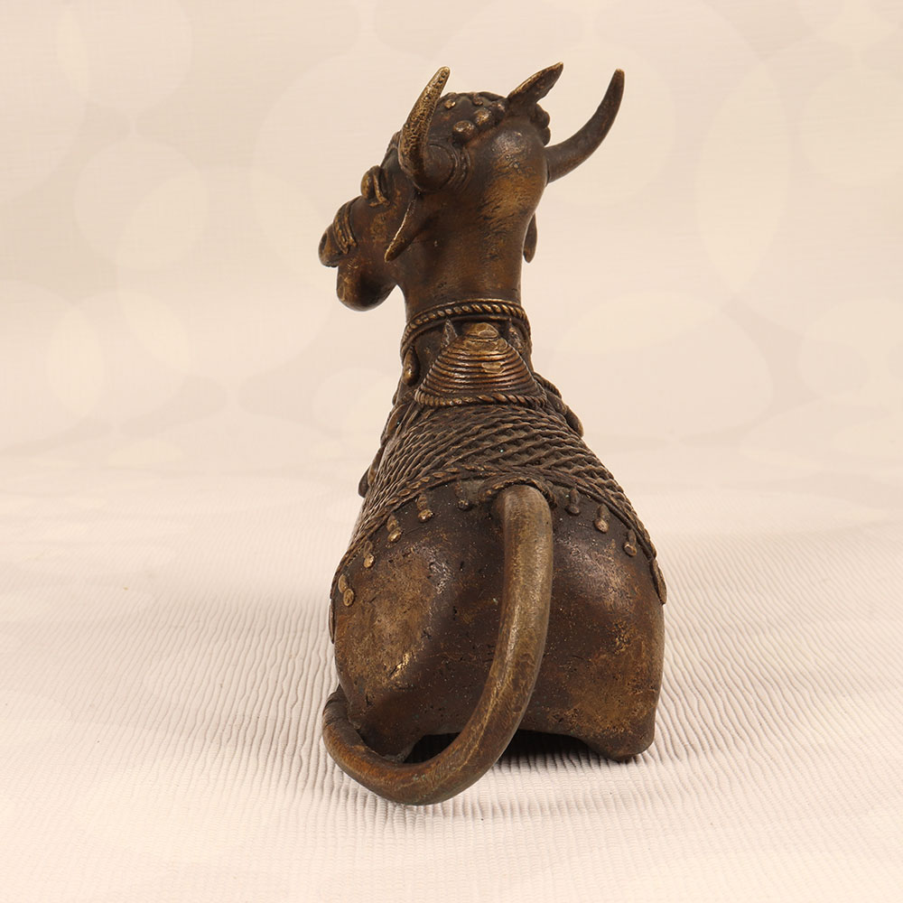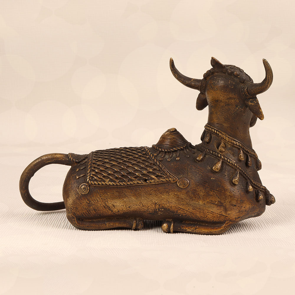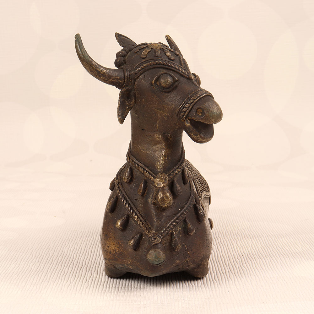 Enhance your sacred space with the timeless elegance of this Vintage Brass Nandi Statue. Crafted in a sitting position, this exquisite piece captures the essence of Nandi, the revered vahana (vehicle) of Lord Shiva. Meticulously handcrafted by skilled Indian artisans in Tribal Art, the statue boasts a rich, dark finish that adds a touch of mystique and antiquity. Made from high-quality brass, this unique creation is a testament to the artistry and craftsmanship of a bygone era. Versatile in its appeal, it seamlessly fits into various settings, be it your home, office, restaurant, hotel, or cafe. Ideal for prayer rooms and as a decorative accent, this Nandi statue adds a spiritual aura to any space. Embrace its historical charm by integrating it into your vintage collection, or present it as a thoughtful gift to your family, friends or relatives on special, festive, or auspicious occasions. Embodying tradition and artistry, this Vintage Brass Nandi Statue is a symbol of timeless beauty and devotion.