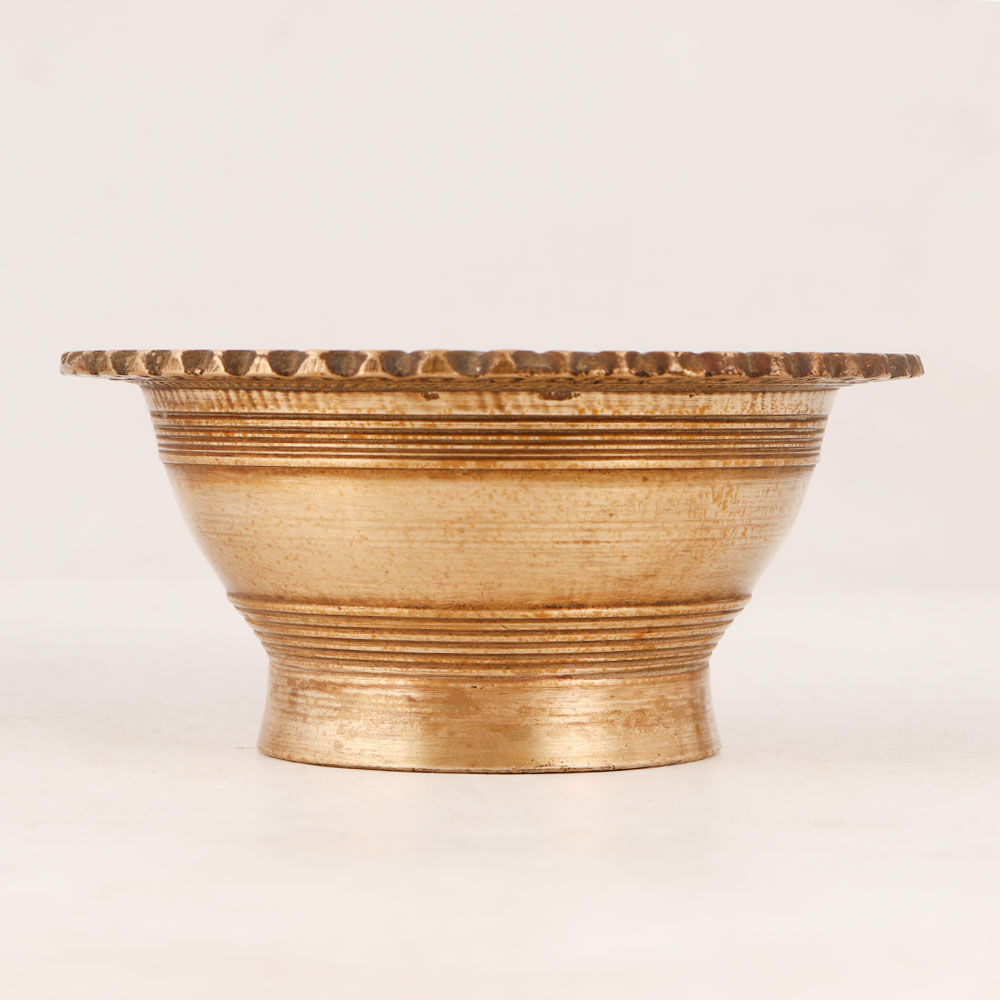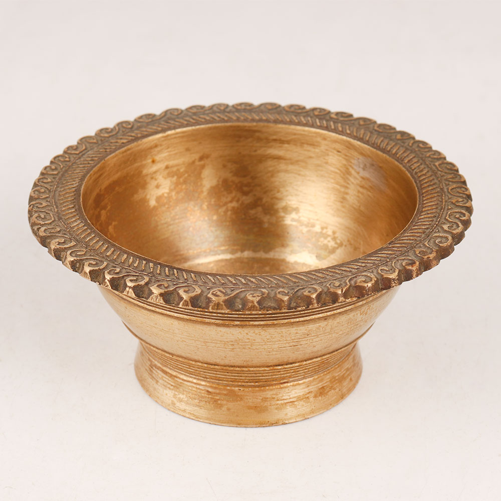 Enhance your spiritual rituals and create an atmosphere of divine connection with this exquisite brass bowl, meticulously crafted for Kumkum Tilak ceremonies. Handmade by highly skilled and experienced Indian craftsmen, this small brass bowl showcases an antique golden finish that exudes timeless elegance. Designed to hold Kumkum, the sacred red powder used in Hindu rituals, this bowl is perfect for placing a Tilak, the mark between the eyebrows symbolizing the spiritual third eye. Its high-quality brass construction not only ensures its authenticity but also resonates with tradition. This versatile piece transcends its ritualistic purpose and becomes an adornment for various settings. Whether adorning your prayer room, temple, home, office, or commercial spaces like restaurants, hotels, and cafes, its presence emanates an aura of spiritual tranquillity and aesthetic allure. Consider this exquisite brass bowl for gifting on special occasions, festivals, or auspicious events. Its intricate craftsmanship and cultural significance make it a thoughtful present, while its potential to enrich a vintage collection or enhance exhibition displays is boundless. Elevate your rituals, ambiance, and gifting gestures with this captivating brass bowl that bridges the gap between tradition and beauty.