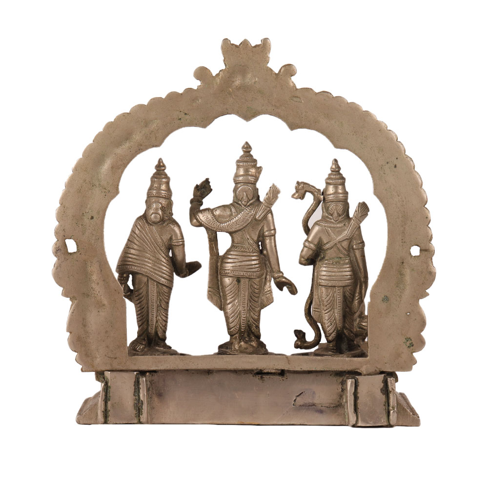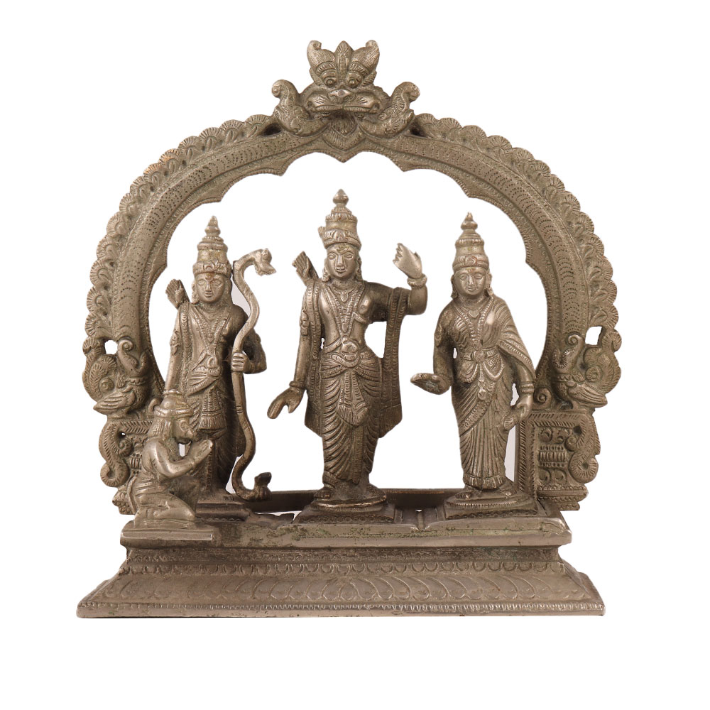 Buy a brass statue of Ram Darbar in a stunning silver finish that is a masterpiece crafted by skilled Indian artisans. Depicting the Hindu God Lord Ram, along with his divine consort Goddess Sita, devoted brother Lord Laxman, and devoted devotee Lord Hanuman, this intricately detailed statue captures the essence of the revered Ram Darbar scene. The statue is perfect for worship at temples or as a centrepiece in your home's prayer room, adding a touch of divinity to any space. Its versatility makes it a perfect addition to restaurants, hotels, gyms, spas, shops, or offices, infusing an auspicious aura wherever it is placed. Handmade with love and attention to detail, this Ram Darbar statue is not only a beautiful piece of art but also a meaningful and thoughtful gift for your loved ones, symbolizing blessings, protection, and prosperity. Bring the divine presence of Lord Ram, Goddess Sita, Lord Laxman, and Lord Hanuman into your life with this exquisite silver-finish brass statue of Ram Darbar.
