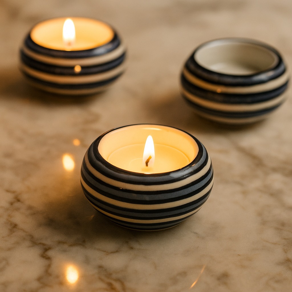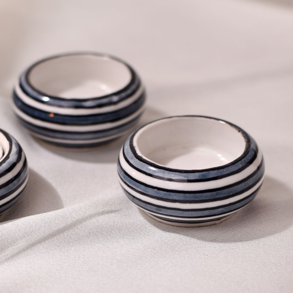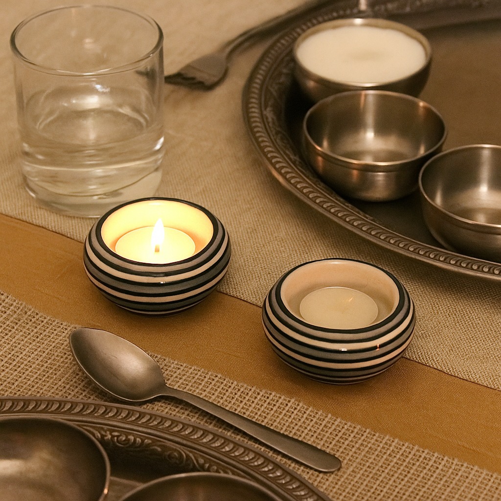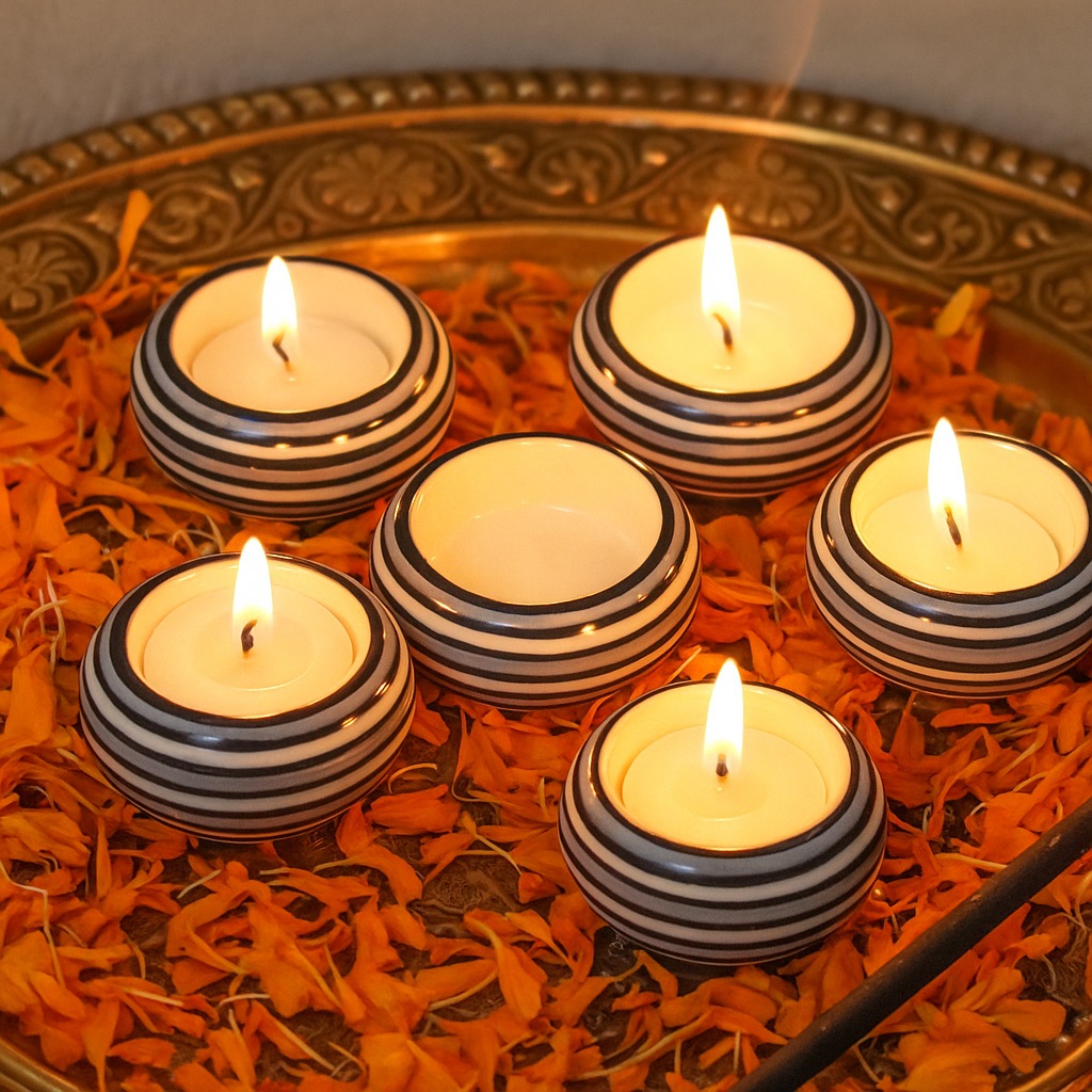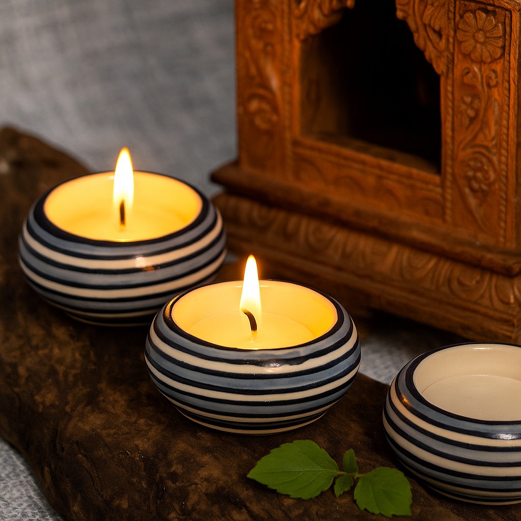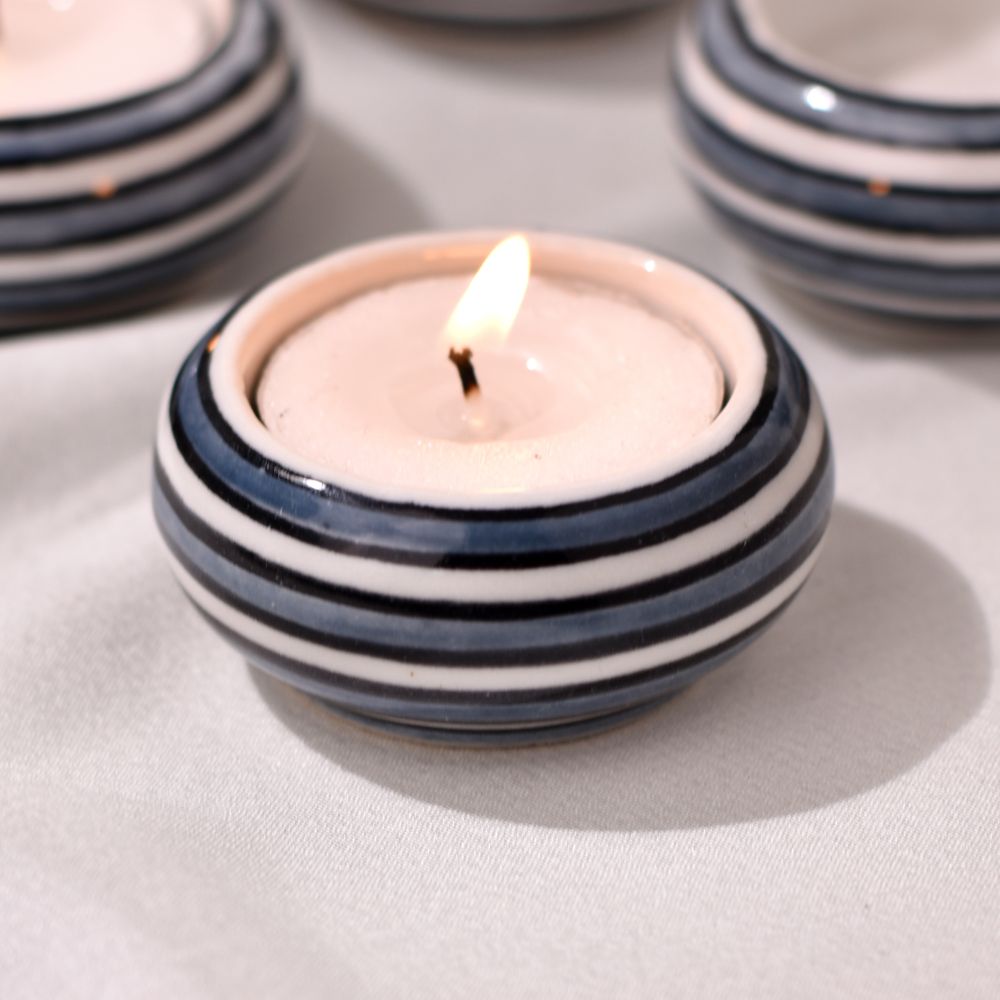 Buy a Ceramic Tea Light Holder online from our website and get a hassle free delivery at your doorstep. Meticulously crafted by talented Indian artisans, this masterpiece is a fusion of high-quality ceramic and traditional craftsmanship. Its delicate white and blue colour pattern draws inspiration from serene vistas, evoking a sense of tranquillity and elegance. A versatile accessory, the tea light holder is designed to grace various settings - from the cosy corners of your home to the inviting interiors of restaurants, cafes, shops, and hotels. Illuminate your surroundings with a soft, enchanting glow that casts captivating shadows through its intricate patterns. Perfect for special occasions, this tea light holder creates a magical atmosphere, fostering cherished moments with your loved ones. Whether it's a romantic dinner, a festive celebration, or an auspicious event, the holder adds a touch of sophistication and charm. Celebrate moments that matter by gifting this exquisite piece to your family, friends or relatives. It's a thoughtful gesture for birthdays, festivals, or any special occasion, encapsulating the beauty of artistry and the warmth of shared experiences. Let the flickering tea light transcend you to a realm of serenity and beauty, making memories that last a lifetime.