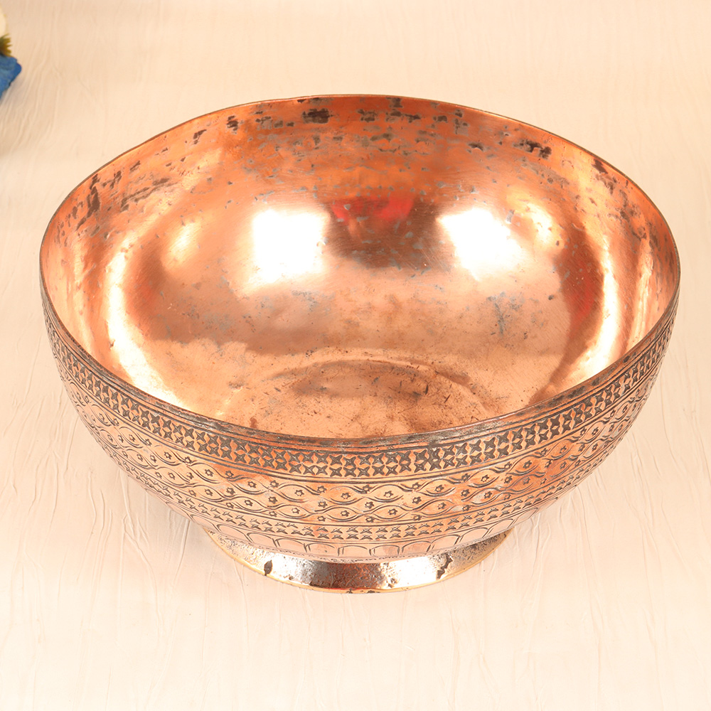 Immerse yourself in the rich cultural heritage of the Islamic world with this exquisite copper bowl, a stunning masterpiece of Peshawari art. Crafted with meticulous attention to detail by skilled artisans, this vintage treasure is a true testament to the enduring beauty of Islamic craftsmanship. Elevate your décor and experience the captivating allure of this copper Islamic bowl. Its striking appearance and functional versatility make it a must-have addition to any home, office, or special event. Whether you're a collector of fine Islamic art or simply seeking to infuse your space with cultural elegance, this remarkable piece is sure to captivate all who behold it. Bring the essence of Peshawari craftsmanship into your life and transform your environment with this exquisite centerpiece. Immerse yourself in the timeless beauty of Islamic artistry and let this copper bowl inspire you to celebrate the rich cultural heritage that it represents.