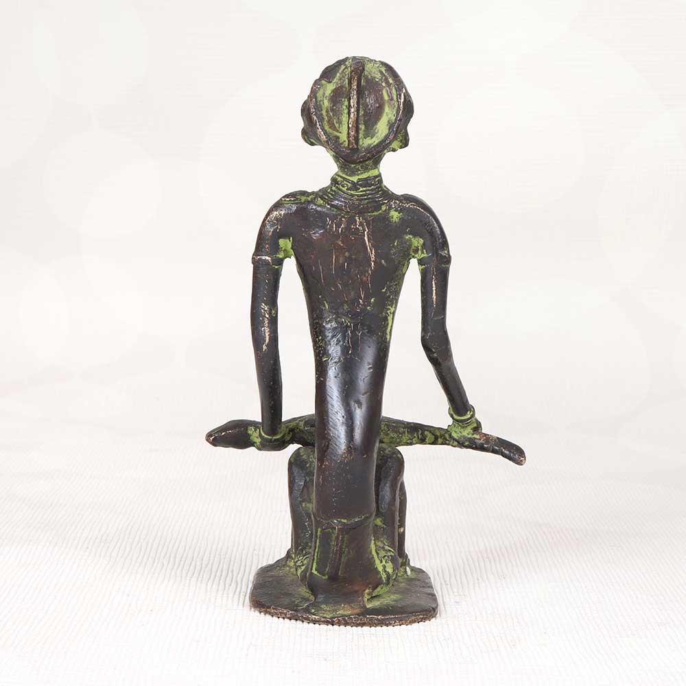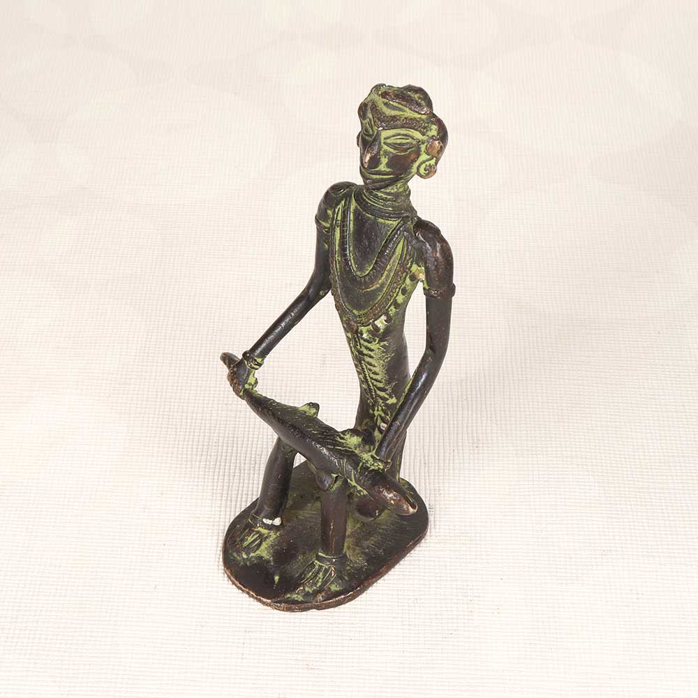 Make a bold statement in your home with this eye-catching vintage brass statue depicting a tribal man sitting and holding a fish. Expertly cast in brass with intricate tribal details, this statue brings the rustic artistry of India's Bastar region to your decor. With its ornate tribal jewelry, headgear, and facial features, this statue celebrates the rich cultural heritage of Bastar's indigenous tribes. The distressed brass finish adds vintage appeal, as if it was unearthed from a global bazaar. Let this tribal man statue infuse your home with faraway lands. Its earthy presence will draw the eye and spark conversations. For an exotic decor piece that transports you, look no further than this vintage Bastar brass statue.