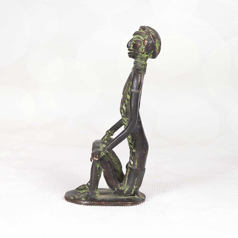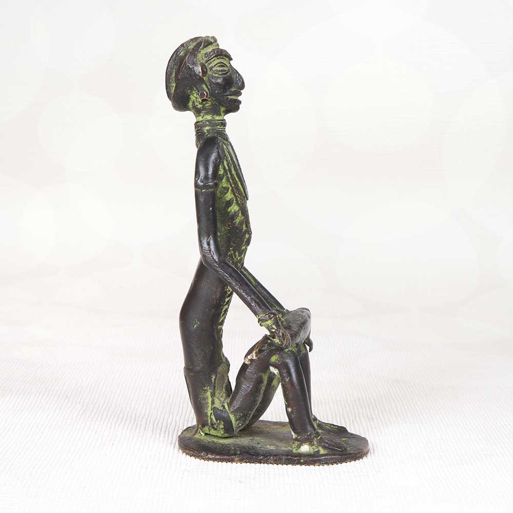 - Intricately detailed brass casting of a sitting tribal man holding up a large fish