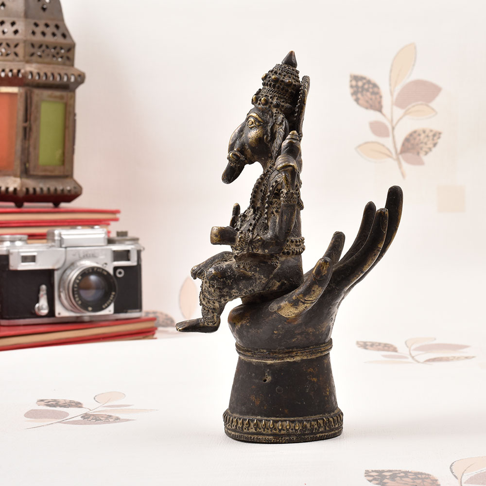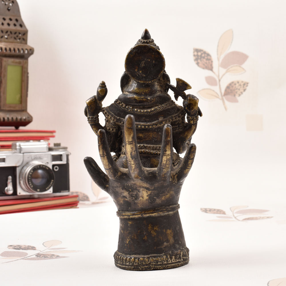 - Ganesha, the remover of obstacles, sits atop a hand-sculpted hand base for a captivating display