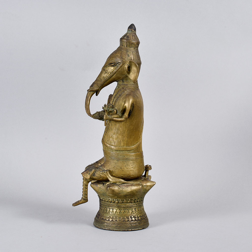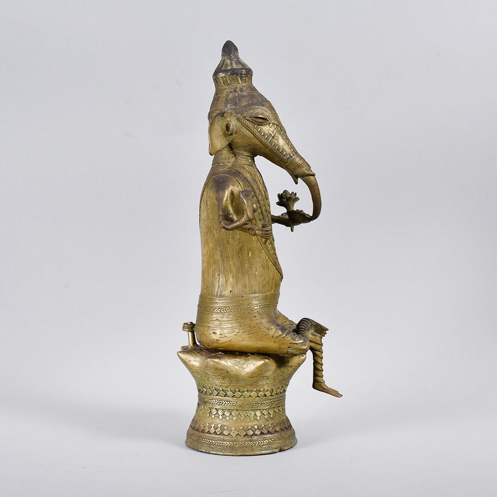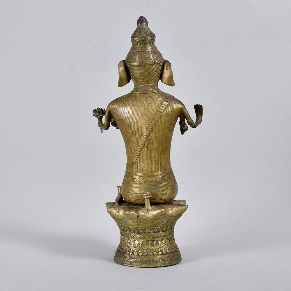 - Exquisitely crafted brass statue of Lord Ganesha seated on a Lotus in Tribal Art style