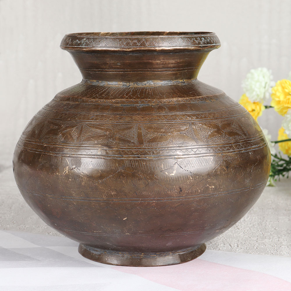 Buy a Vintage Brass Cooking Pot online that is a true testament to the craftsmanship of highly skilled Indian artisans from Gujarat. Handmade with precision and passion, this pot boasts a charming antique brown finish that exudes warmth and nostalgia. Crafted from high-quality brass, this pot carries the rich heritage of Indian metalwork, making it a symbol of elegance and tradition. While its primary function was once culinary, we recommend using it for decoration purposes only, preserving its vintage charm. Versatile in its appeal, this pot can grace your home, office, restaurant, hotel, cafe, or shop with its timeless allure. Place it prominently as a decorative centerpiece or repurpose it as a unique flower pot to infuse nature's beauty into your space. For collectors and curators, this Vintage Brass Cooking Pot is a must-have addition to your vintage collection, perfect for exhibition displays that tell a story of artistry and culture. Moreover, it makes for a thoughtful and meaningful gift for your family, friends or relatives on special, festive, or auspicious occasions, symbolizing the timeless bond of tradition and heritage. Embrace the allure of the past and make a statement with this remarkable piece of history.