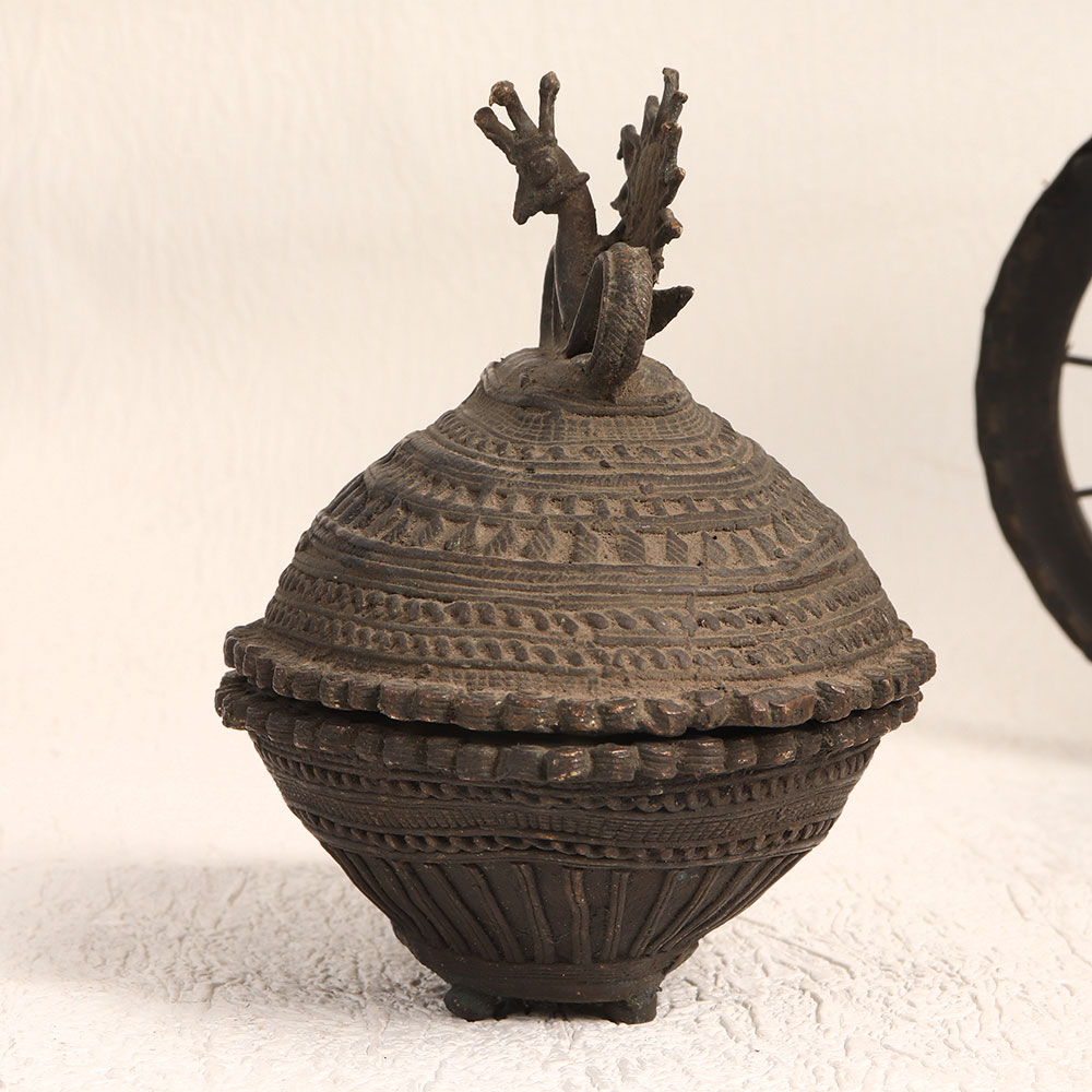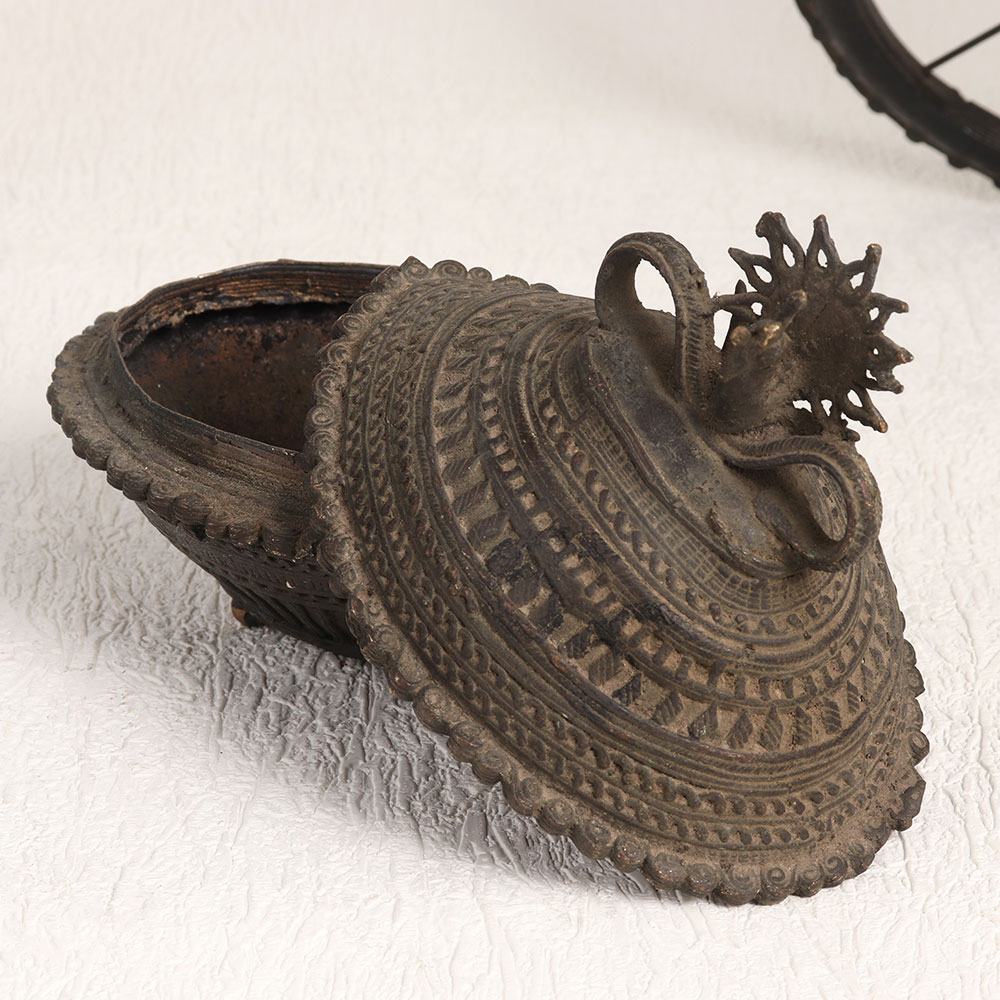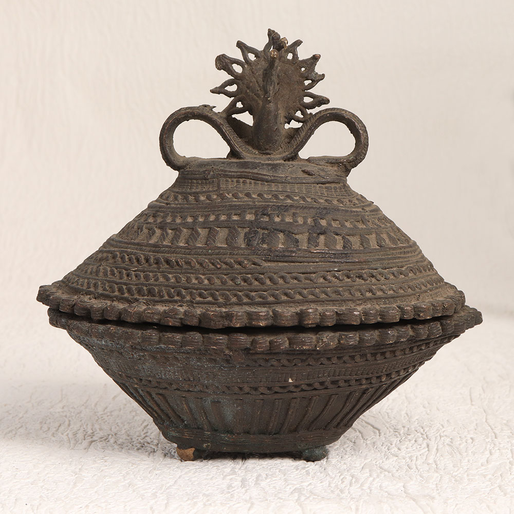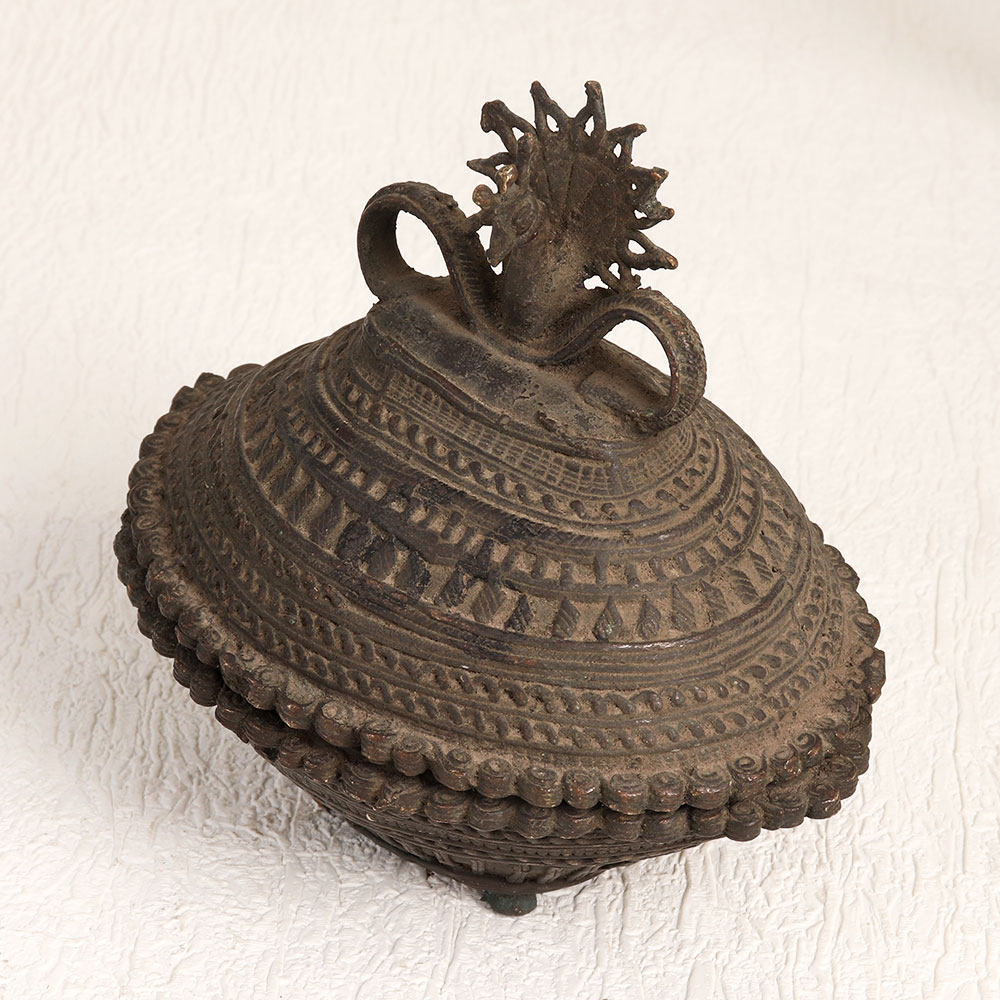 This Vintage Brass Prayer Kumkum Box in an oval shape is a masterpiece adorned with a finely carved peacock on its lid, showcasing impeccable Tribal Art craftsmanship. Crafted by professional artisans, this remarkable piece boasts a rich antique dark finish, exuding an aura of timeless elegance. Handmade with precision and care, using only the finest quality brass, this kumkum box serves a multitude of purposes. Whether gracing your home, office, restaurant, hotel, cafe, or shop, it serves as both a captivating decorative element and a symbol of spiritual devotion. It's more than just an accessory, it's a testament to craftsmanship, spirituality, and timeless beauty. This versatile artefact is not only a valuable addition to your vintage collection but can also steal the limelight at exhibitions and displays. Its unique charm makes it an ideal gift for your family, friends or relatives on special, festive, or auspicious occasions, symbolizing your appreciation for their spirituality and aesthetics. Embrace tradition and artistry while adding a touch of sophistication to your space with our Vintage Brass Prayer Kumkum Box.