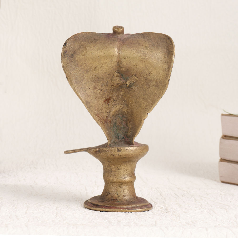 Enhance your spiritual space with the timeless elegance of this exquisite Vintage Brass Lingam with Cobra featuring a captivating antique brown finish. Crafted with precision and passion by highly skilled Indian artisans, this piece embodies the rich heritage of Indian craftsmanship. Made from high-quality brass, this Lingam serves as a symbol of divinity and spirituality, offering a serene focal point for your prayers and meditation. Its intricate design showcases a gracefully coiled cobra, representing Lord Shiva's protective energy. This masterpiece is a fusion of artistry and devotion. Versatile in its utility, this vintage brass Lingam can grace any setting - be it your home, office, restaurant, hotel, cafe, or shop's prayer room. Its majestic presence not only fosters spiritual contemplation but also elevates the aesthetic appeal of your space. Whether you're an ardent collector of vintage treasures or planning to exhibit it in your gallery, this Lingam is a conversation starter. It also makes for a thoughtful and auspicious gift for your family, friends or relatives during special occasions or festivals, bestowing upon them blessings and timeless beauty. Embrace the artistry and spirituality of India with this vintage masterpiece.