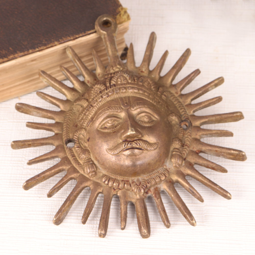 This Vintage Sun God Brass Plate is a masterpiece handcrafted by highly skilled Indian artisans in a rich antique brown finish. Crafted with precision and passion, this stunning piece is a testament to the artistry and craftsmanship of India's ancient traditions. The centerpiece of this magnificent brass plate is the resplendent Sun God, a symbol of power, vitality, and divinity in Hindu mythology. The Sun God, also known as Surya, is revered for bestowing light, energy, and life upon the world. Placing this plate in your home, office, restaurant, hotel, shop, or cafe's prayer room not only adds a touch of elegance but also invites positive energy and blessings into your space. Its versatile design makes it suitable for both decorative purposes and spiritual reverence. The Vintage Sun God Brass Plate is a timeless addition to your collection of vintage artefacts and can be proudly displayed at exhibitions, showcasing its rich heritage and aesthetic appeal. Moreover, this plate makes for a thoughtful and meaningful gift for your family, friends or relatives on special, festive, or auspicious occasions, conveying your best wishes and the warmth of tradition. Embrace the beauty of Indian craftsmanship with this Vintage Sun God Brass Plate and let it illuminate your life with its timeless charm and spirituality.