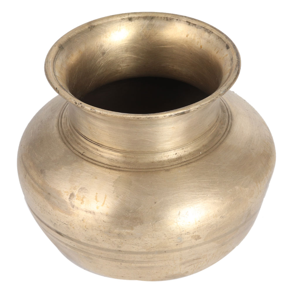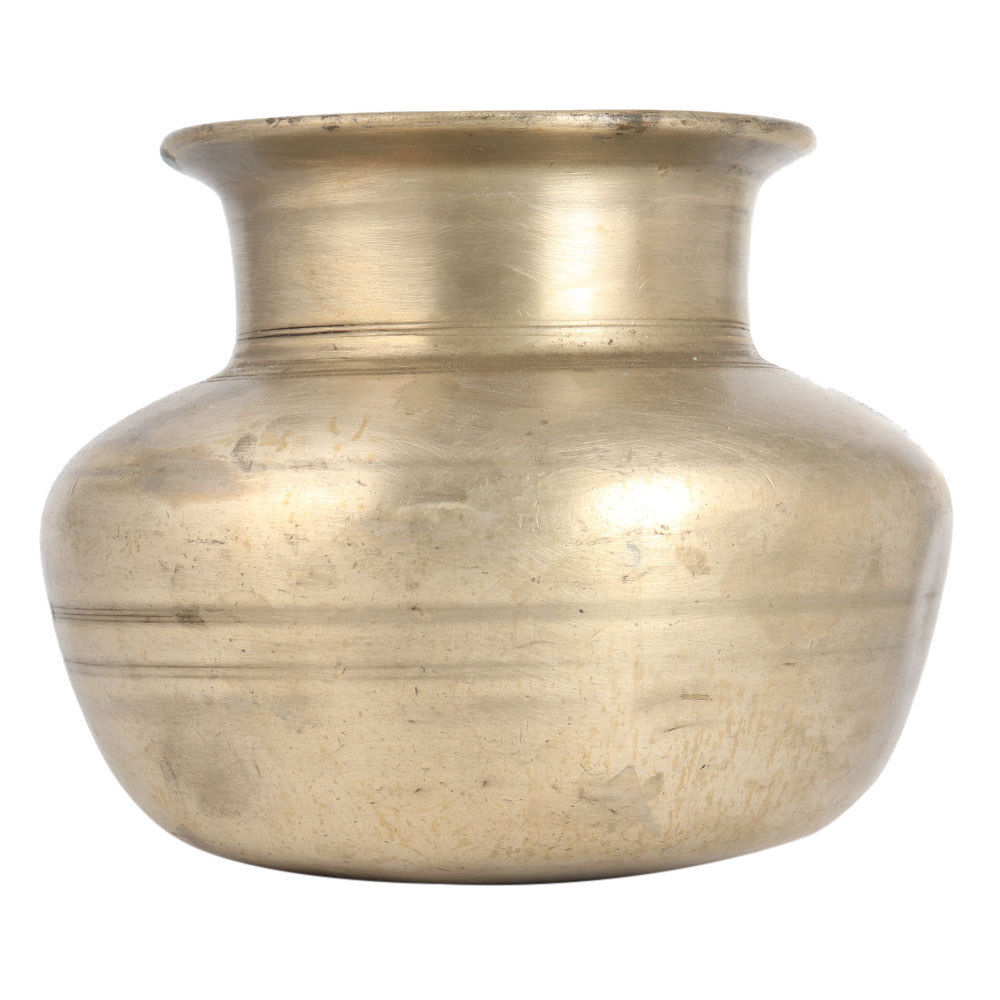 This vintage Kalash or water pot is hand carved by skilled Indian workers using ancient methods. It is made of brass alloy with a curved bottom. It has a shiny antique finish. Hindus often use this Kalash as a Purna Kalash in rituals. A Kalash is a water pot with a small mouth, large enough to hold a coconut and a large belly. It becomes a Purna Kalash when it is filled with water or rice and mango leaves are placed on it so that they touch the water and a coconut placed on top. A perfect piece for your vintage collection.